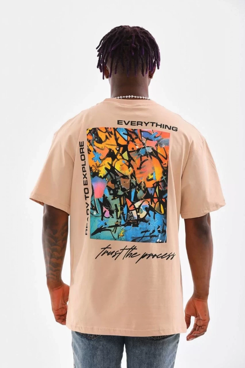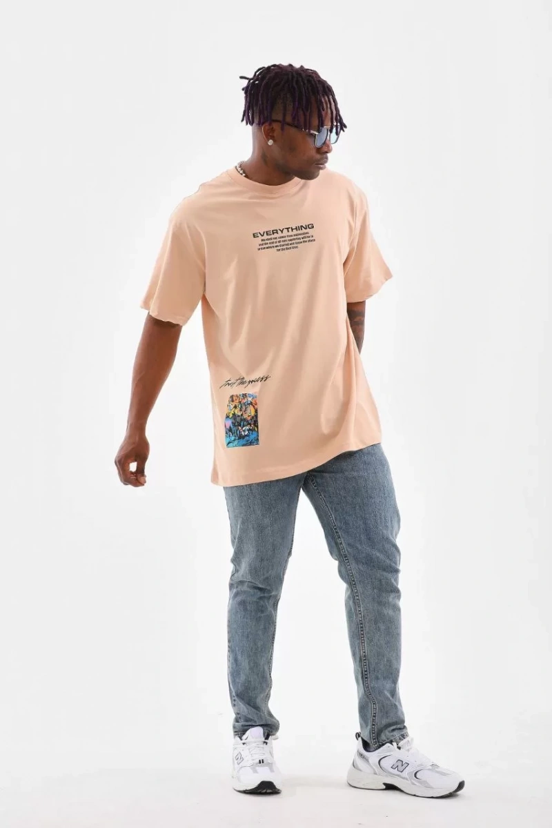 Unisex Bisiklet Yaka Baskılı Oversize T-Shirt - Bej