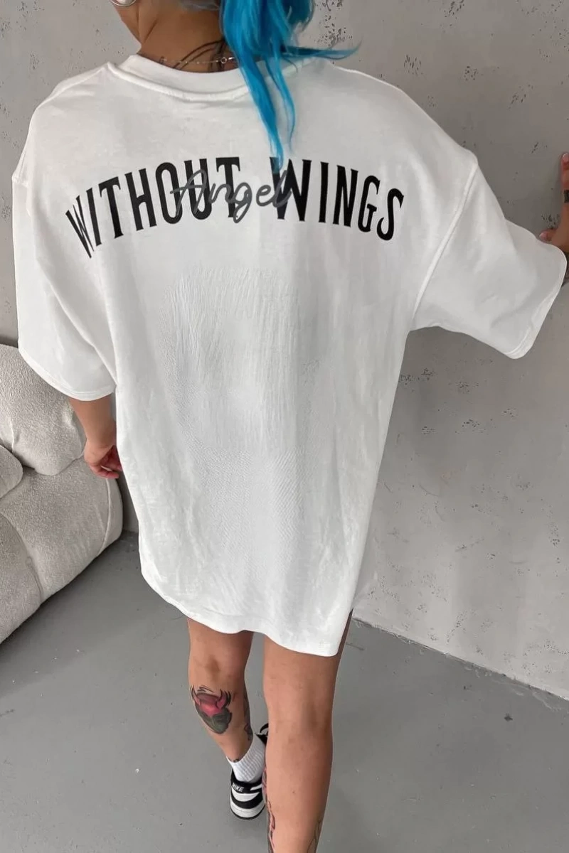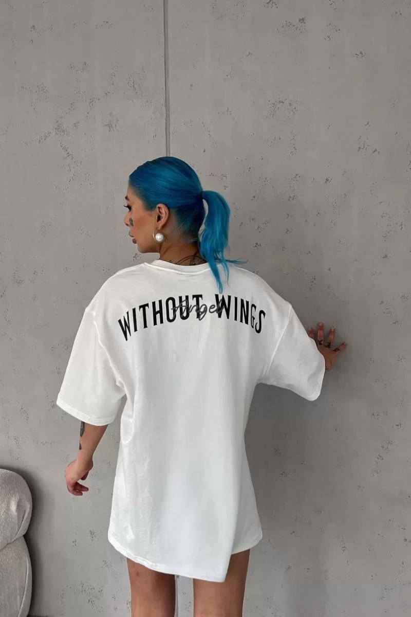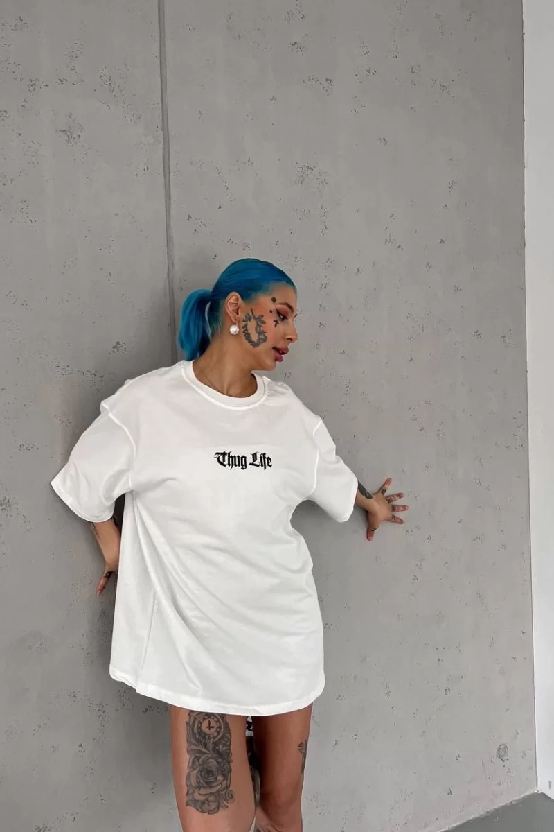 Unisex Bisiklet Yaka Baskılı Oversize T-Shirt - Beyaz