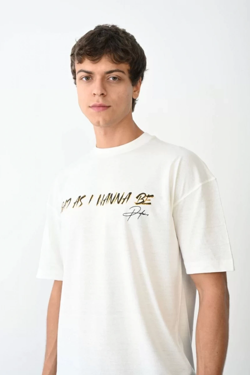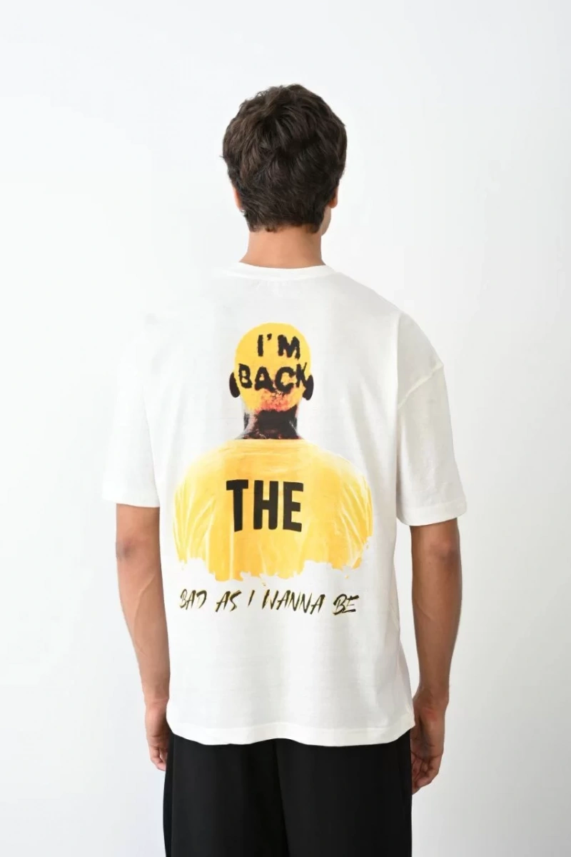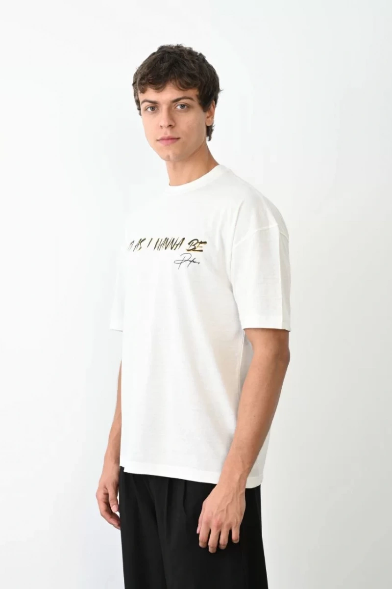 Unisex Bisiklet Yaka Baskılı Oversize T-Shirt - Beyaz