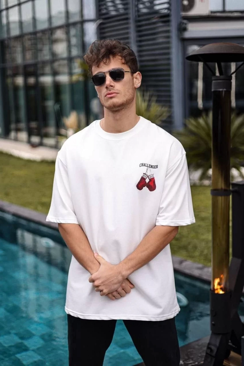 Unisex Bisiklet Yaka Baskılı Oversize T-Shirt - Beyaz