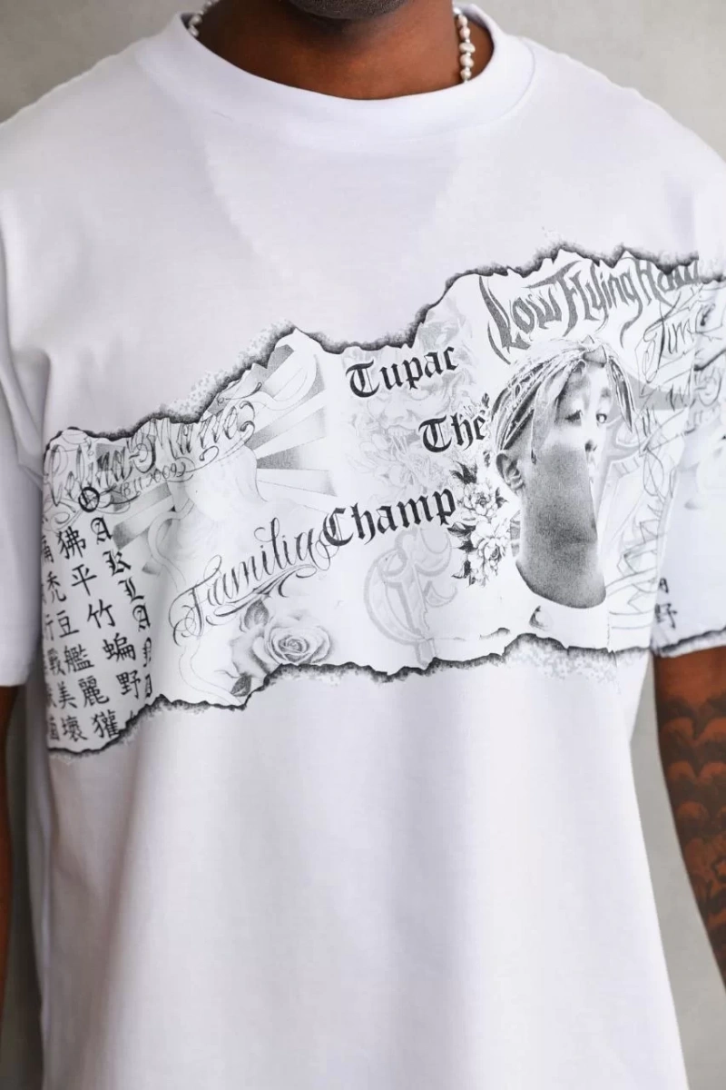 Unisex Bisiklet Yaka Baskılı Oversize T-Shirt - Beyaz