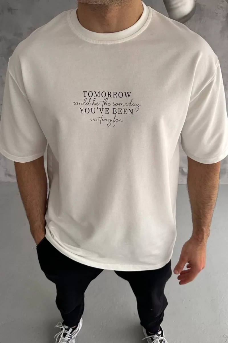 Unisex Bisiklet Yaka Baskılı Oversize T-Shirt - Beyaz