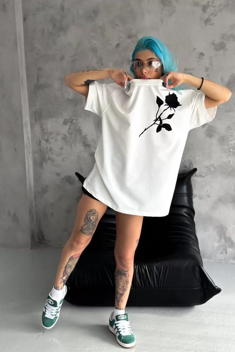 Unisex Bisiklet Yaka Baskılı Oversize T-Shirt - Beyaz
