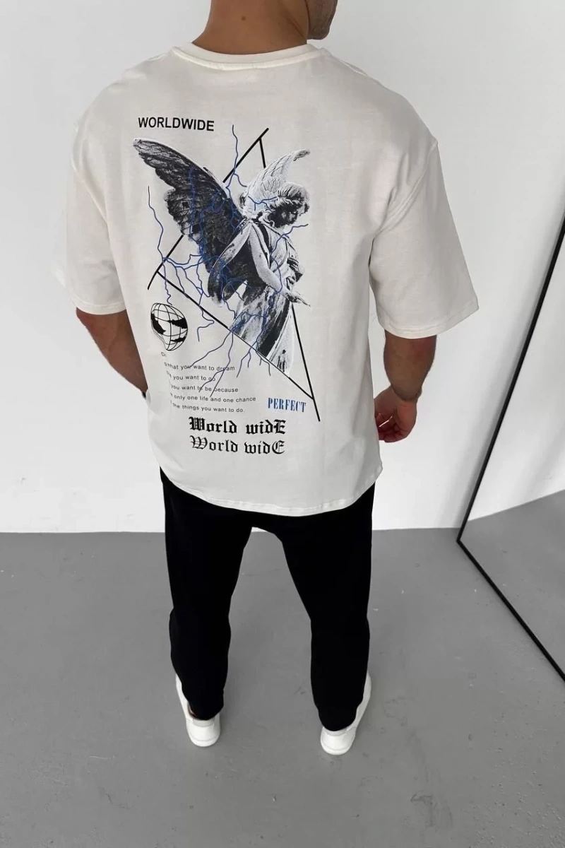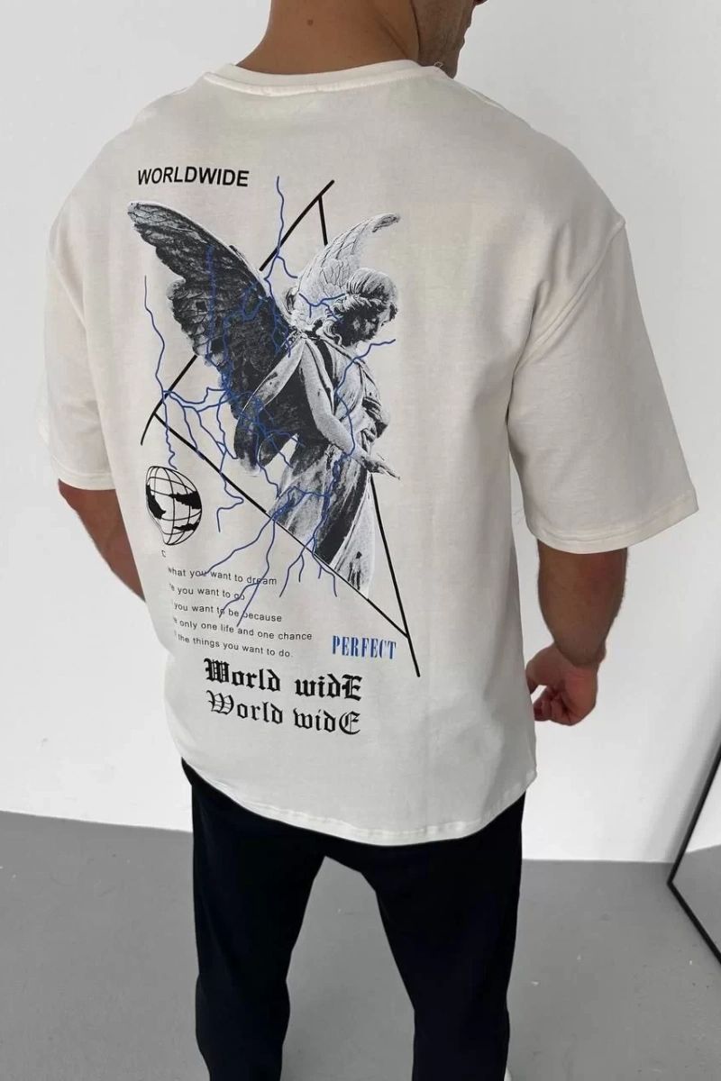 Unisex Bisiklet Yaka Baskılı Oversize T-Shirt - Beyaz