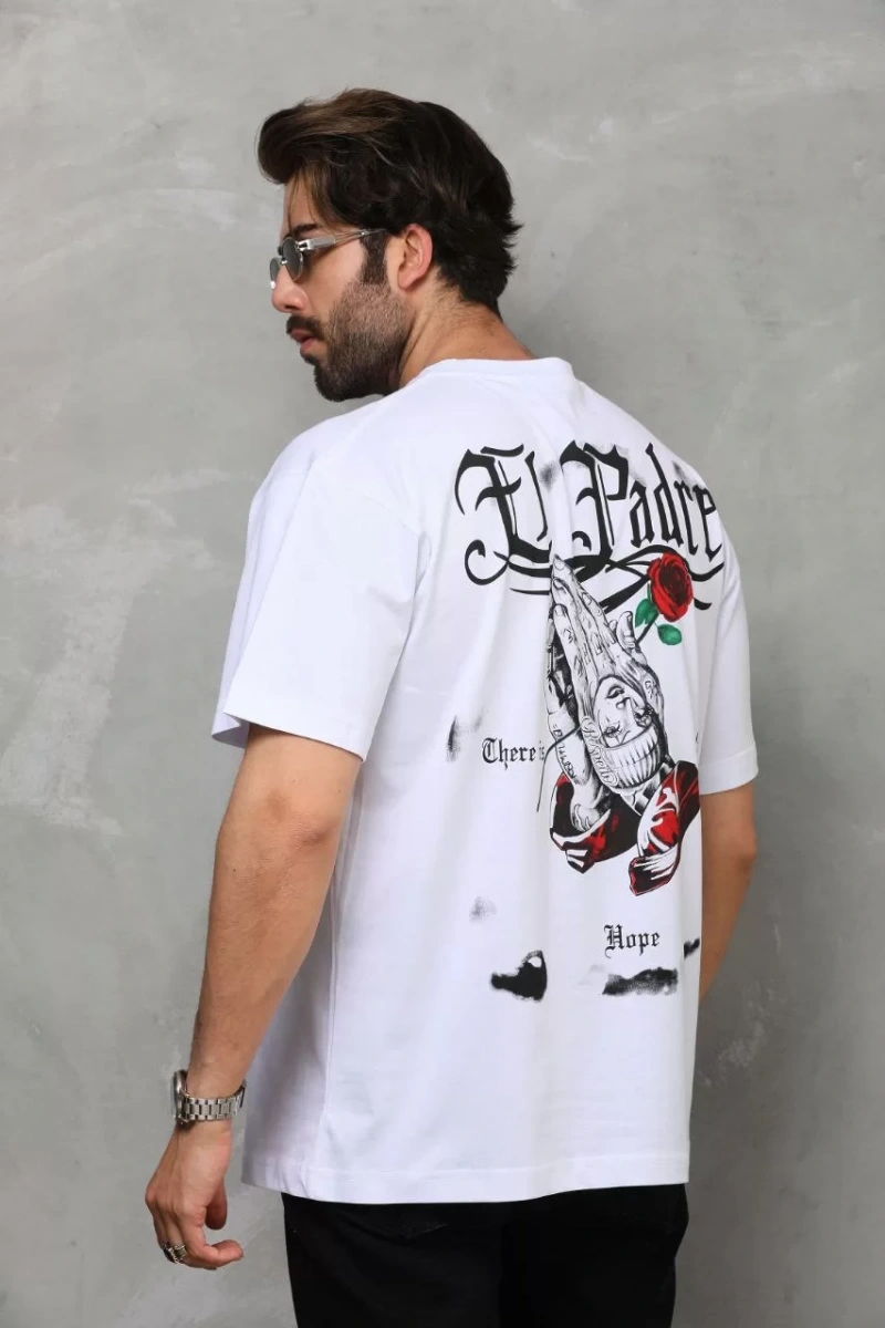 Unisex Bisiklet Yaka Baskılı Oversize T-Shirt - Beyaz