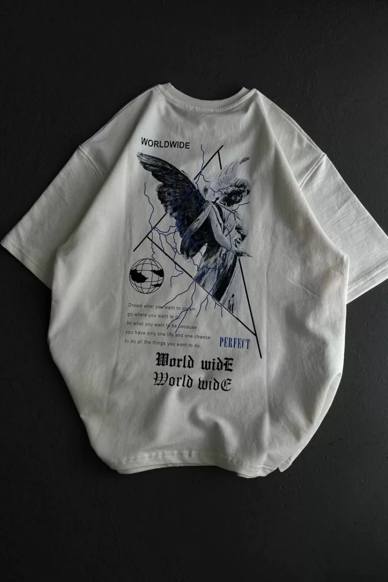 Unisex Bisiklet Yaka Baskılı Oversize T-Shirt - Beyaz