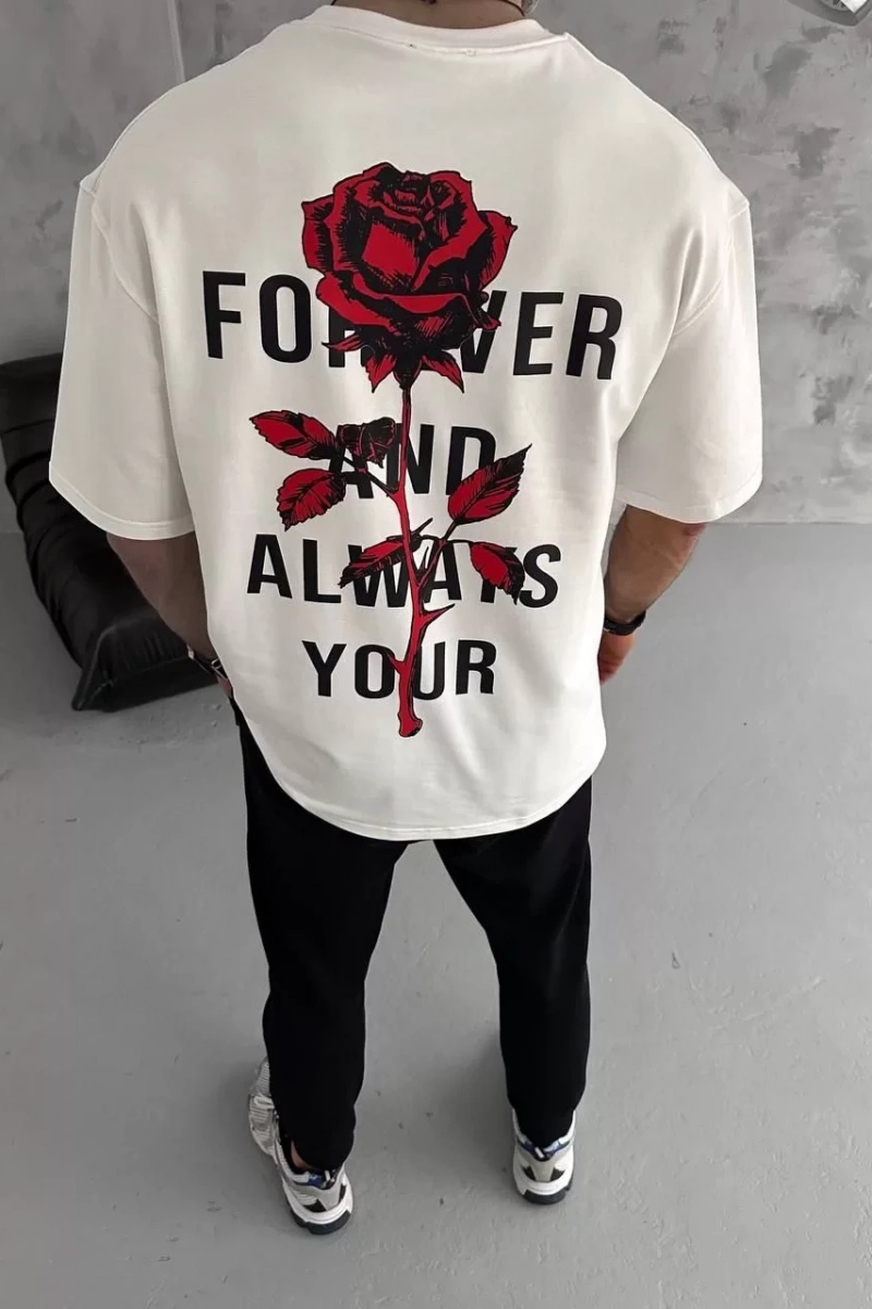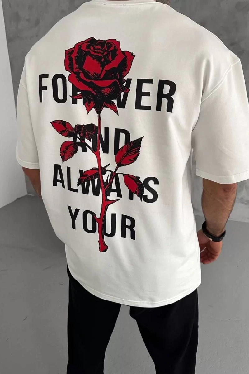 Unisex Bisiklet Yaka Baskılı Oversize T-Shirt - Beyaz