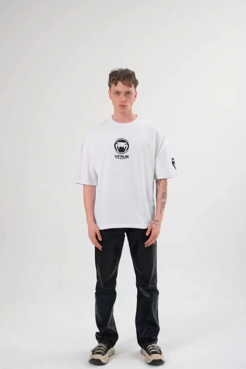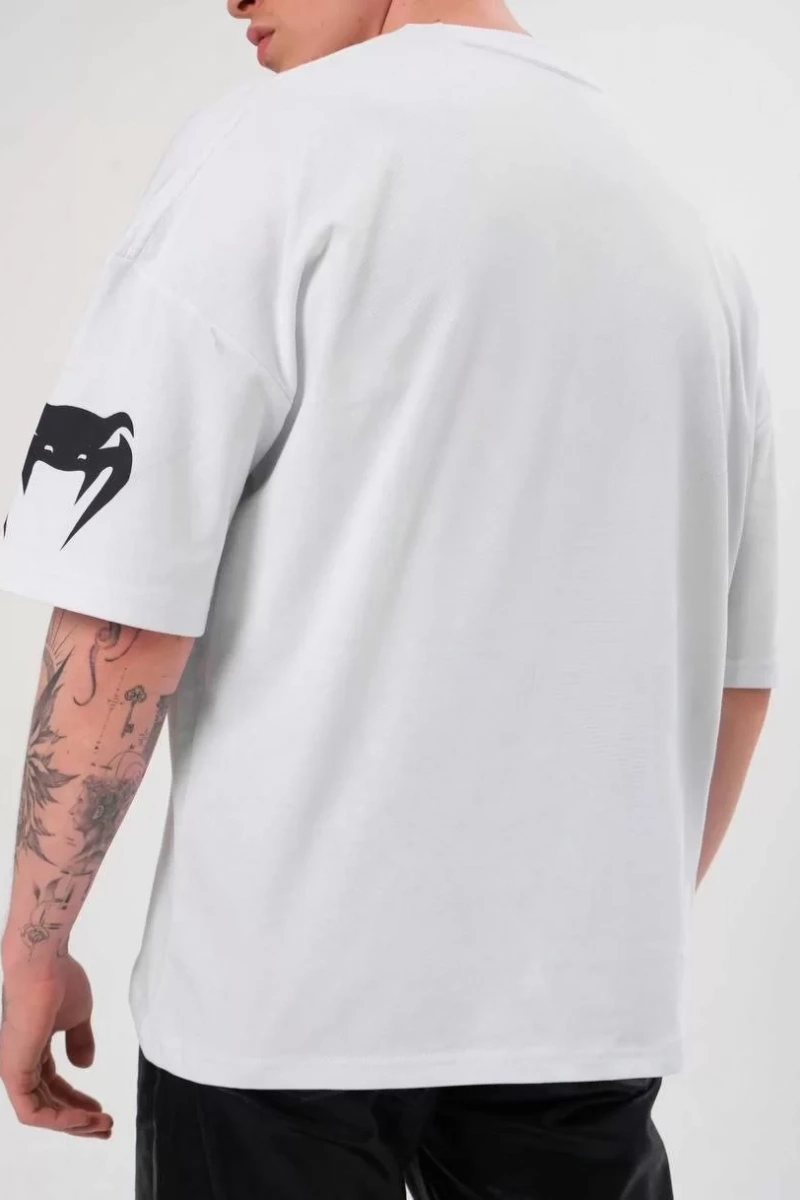 Unisex Bisiklet Yaka Baskılı Oversize T-Shirt - Beyaz