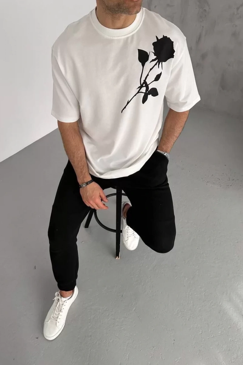 Unisex Bisiklet Yaka Baskılı Oversize T-Shirt - Beyaz