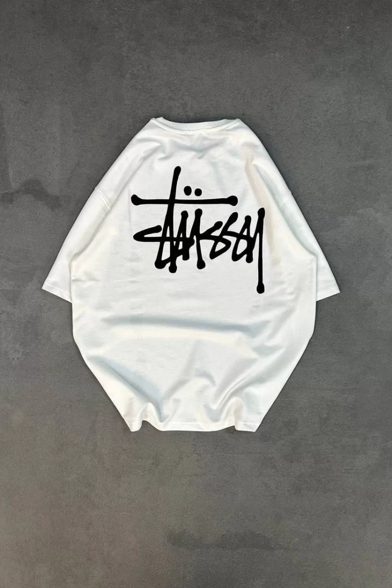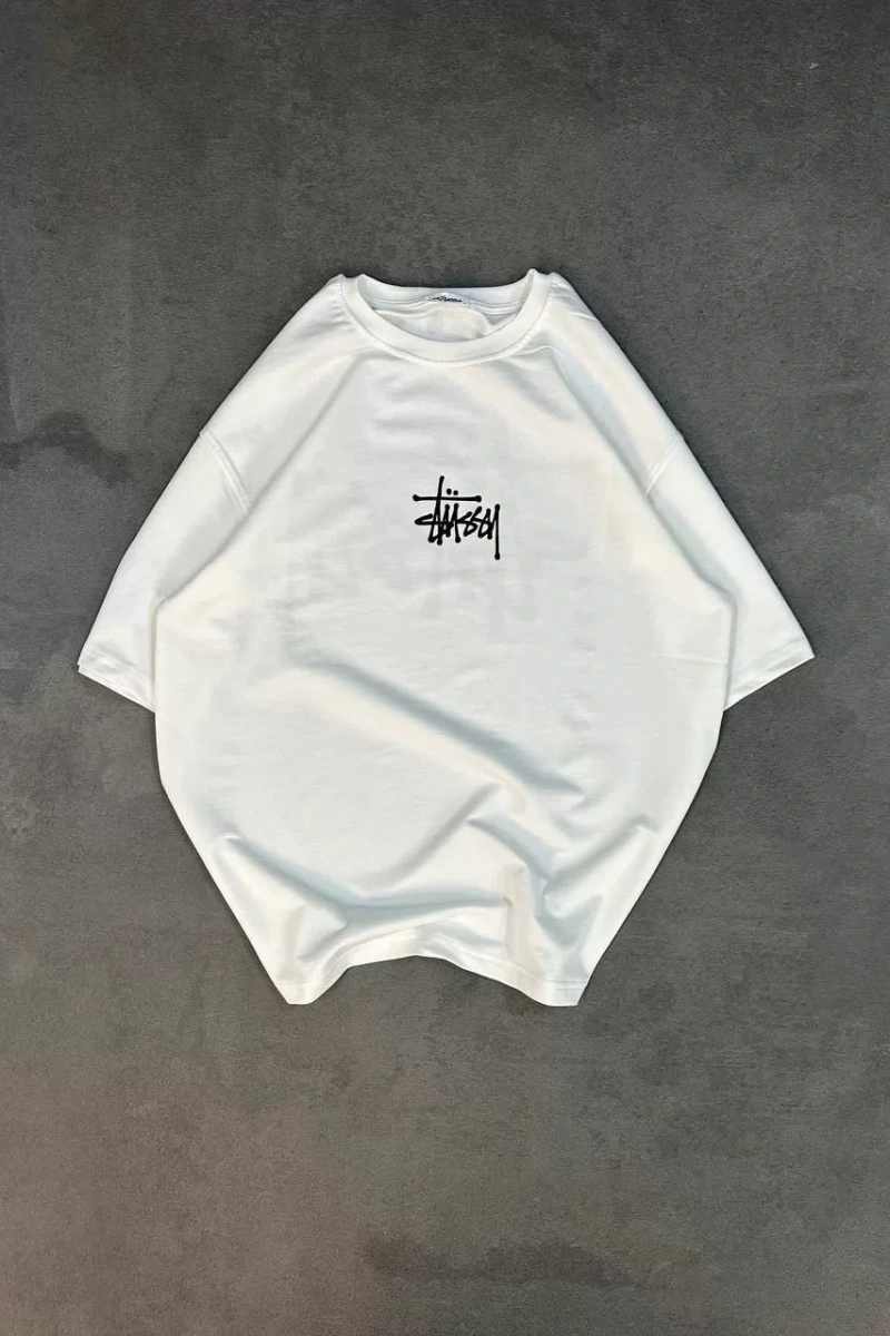 Unisex Bisiklet Yaka Baskılı Oversize T-Shirt - Beyaz
