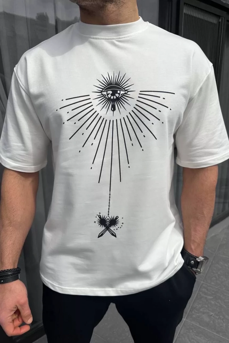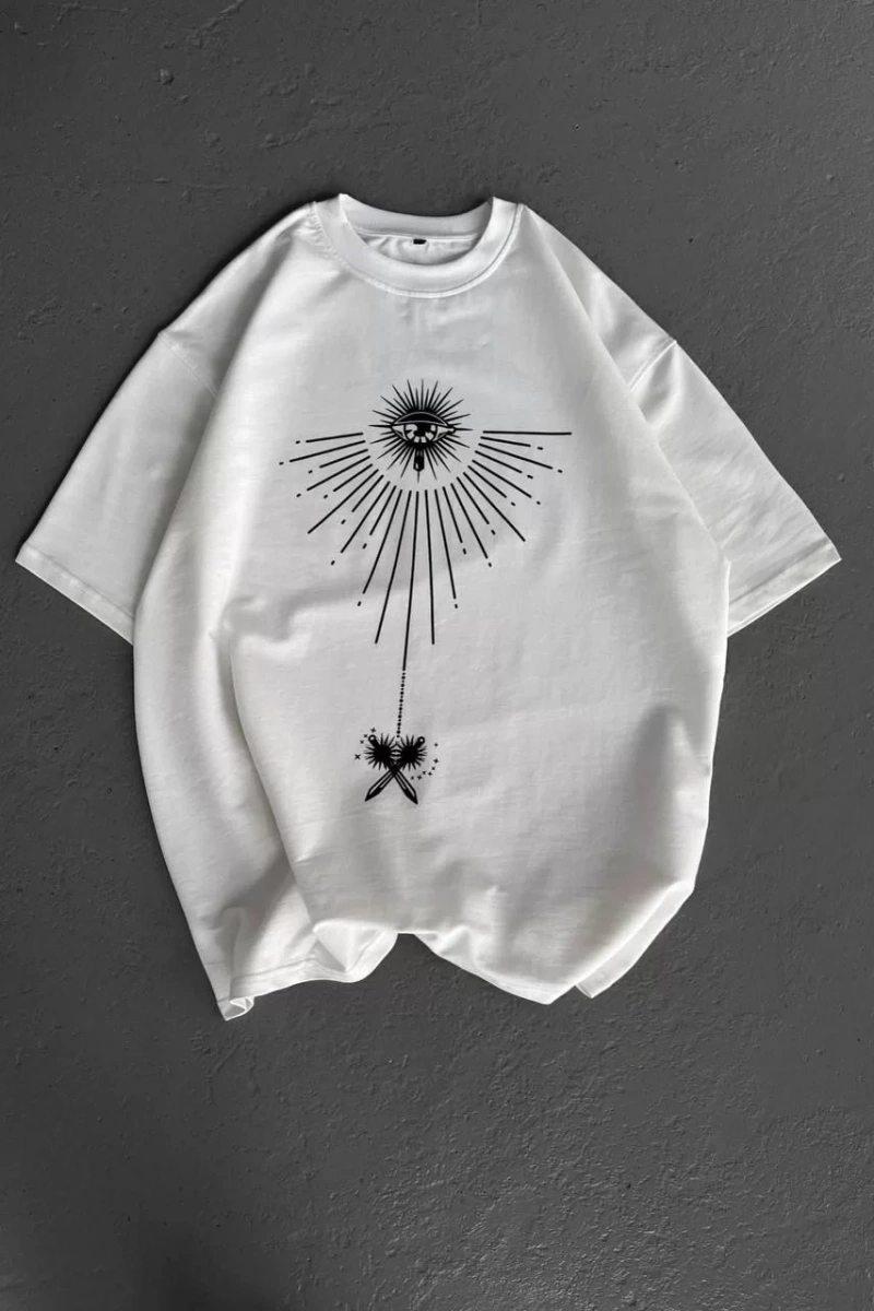 Unisex Bisiklet Yaka Baskılı Oversize T-Shirt - Beyaz