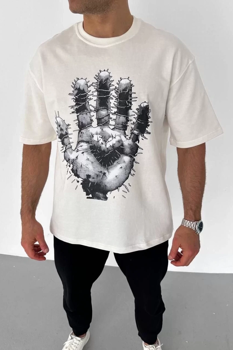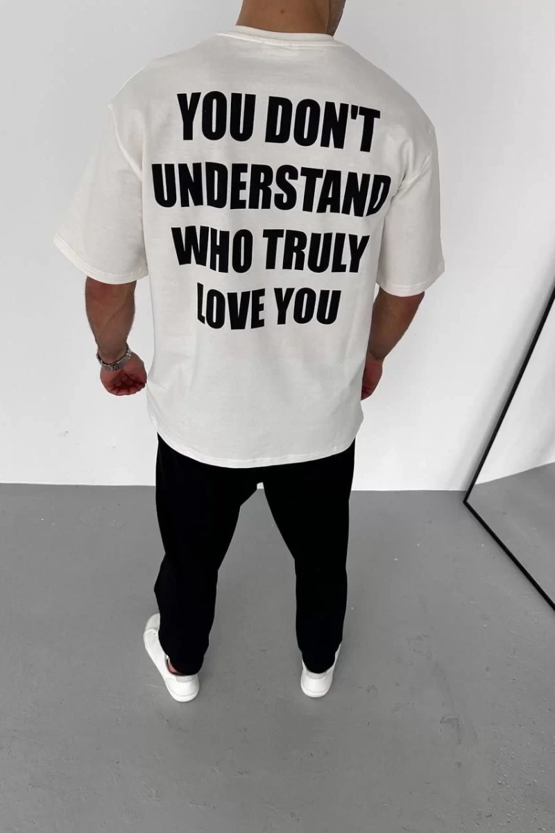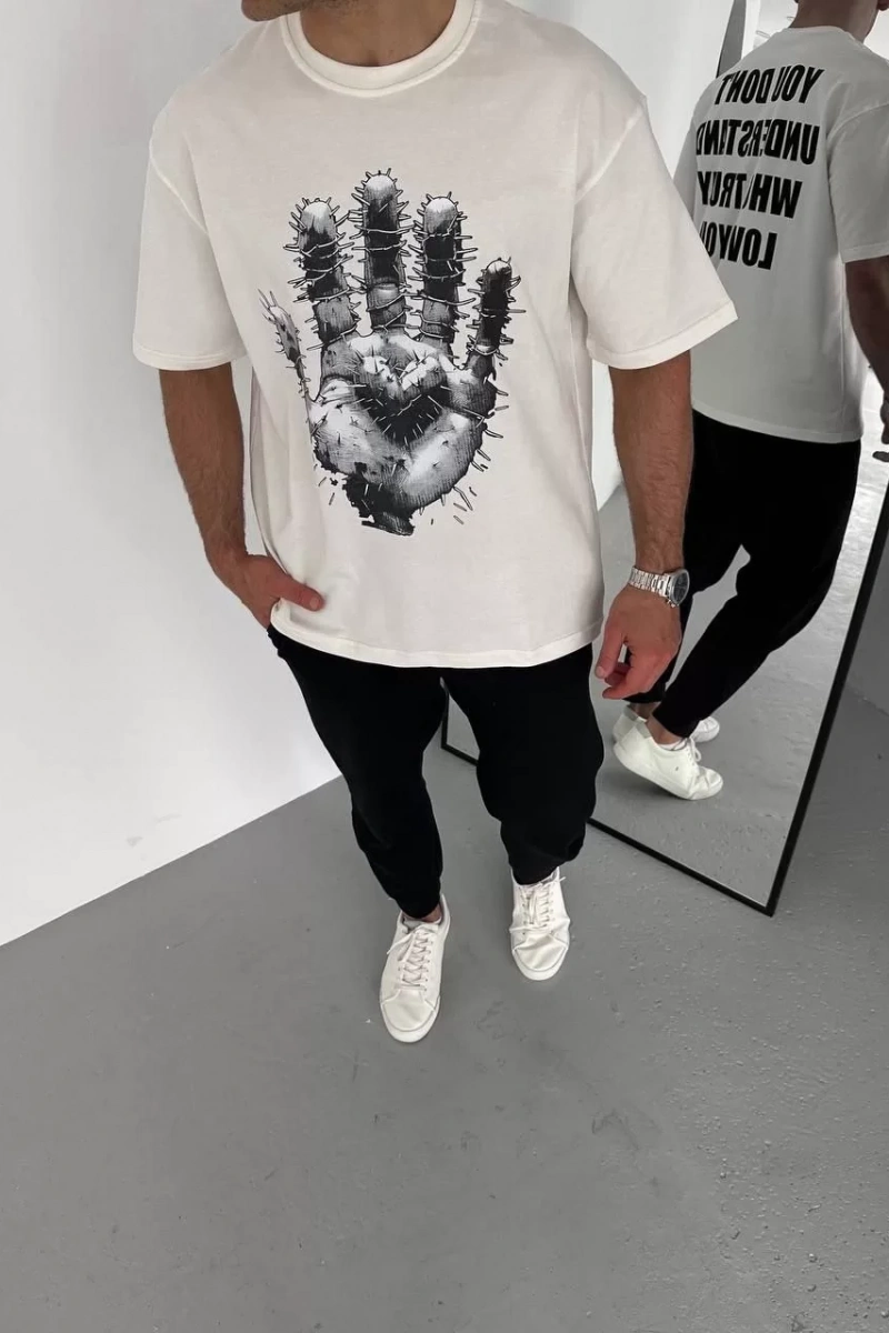 Unisex Bisiklet Yaka Baskılı Oversize T-Shirt - Beyaz