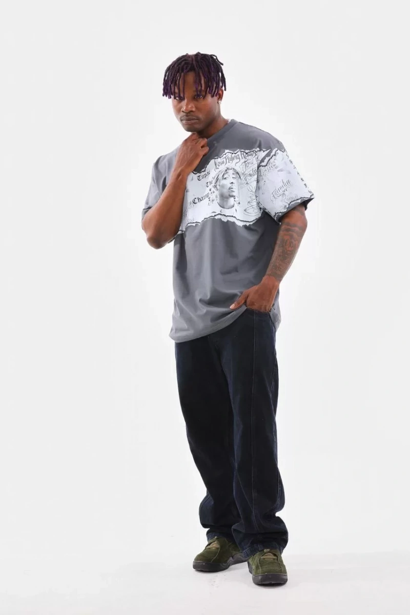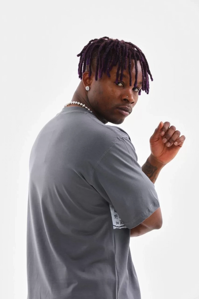 Unisex Bisiklet Yaka Baskılı Oversize T-Shirt - Gri