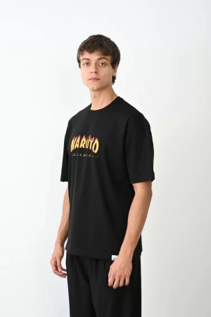 Unisex Bisiklet Yaka Baskılı Oversize T-Shirt - Siyah