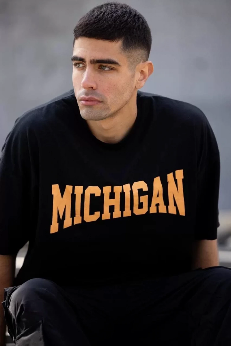 Unisex Bisiklet Yaka Baskılı Oversize T-Shirt - Siyah