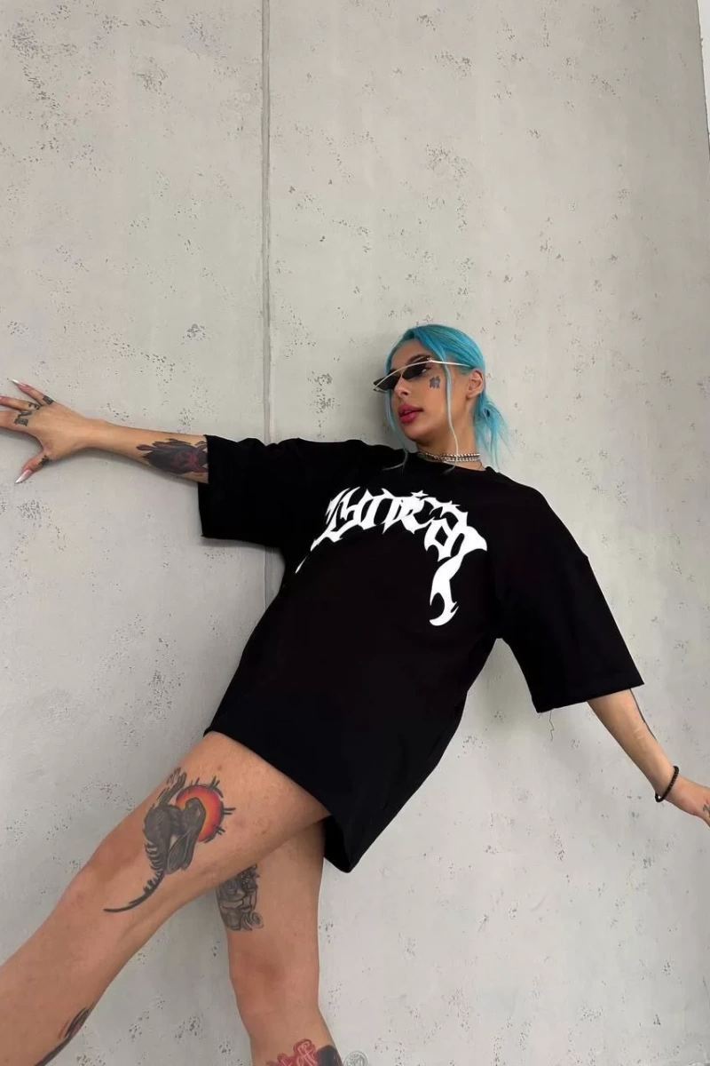 Unisex Bisiklet Yaka Baskılı Oversize T-Shirt - Siyah