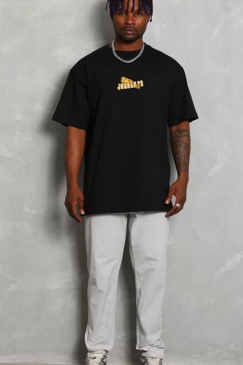 Unisex Bisiklet Yaka Baskılı Oversize T-Shirt - Siyah