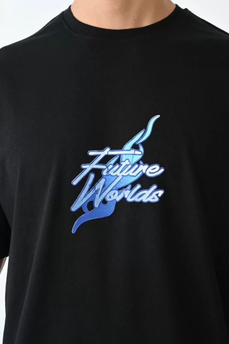 Unisex Bisiklet Yaka Baskılı Oversize T-Shirt - Siyah