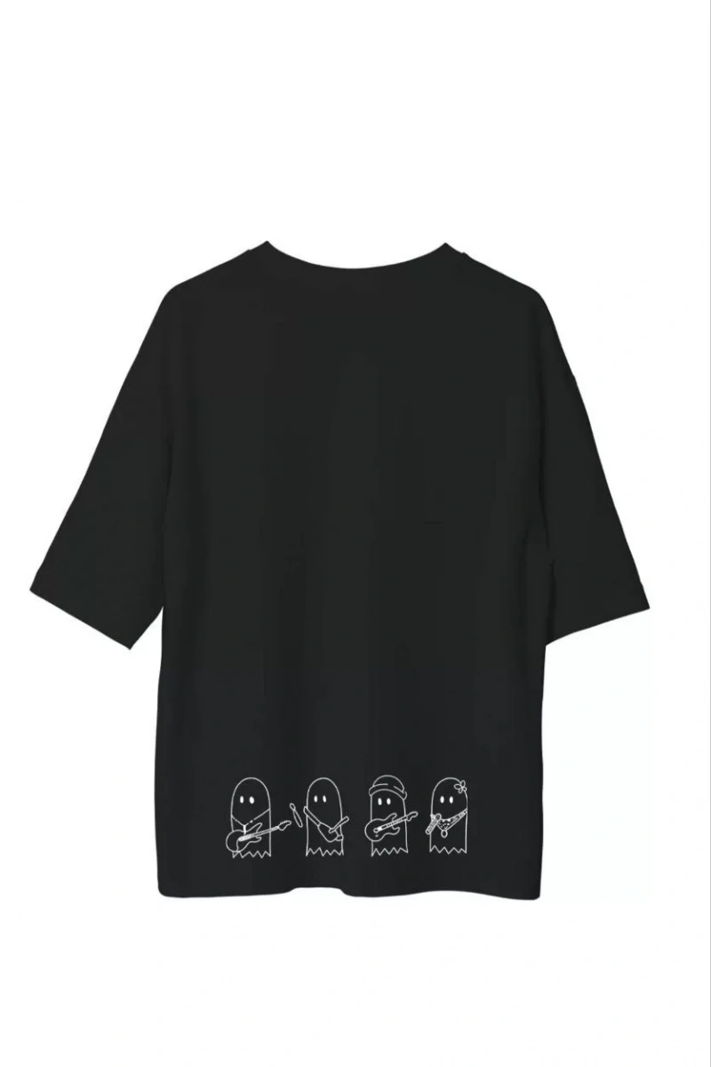 Unisex Bisiklet Yaka Baskılı Oversize T-Shirt - Siyah