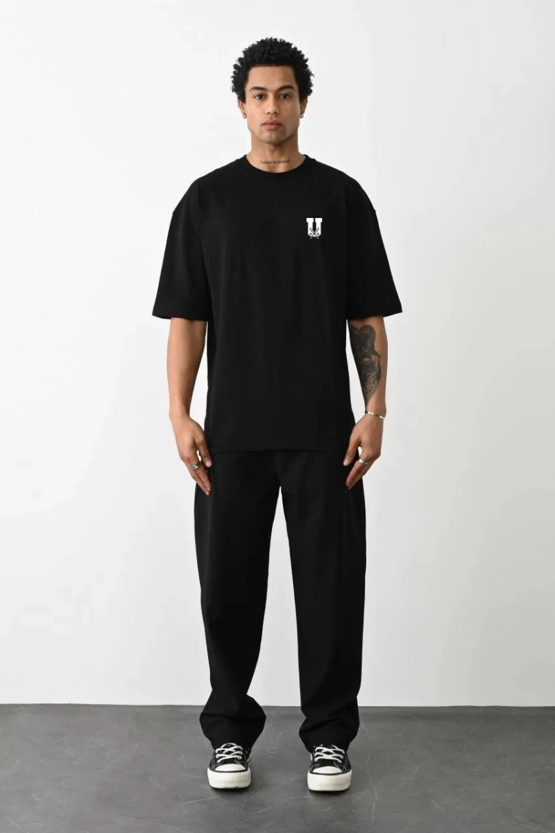 Unisex Bisiklet Yaka Baskılı Oversize T-Shirt - Siyah