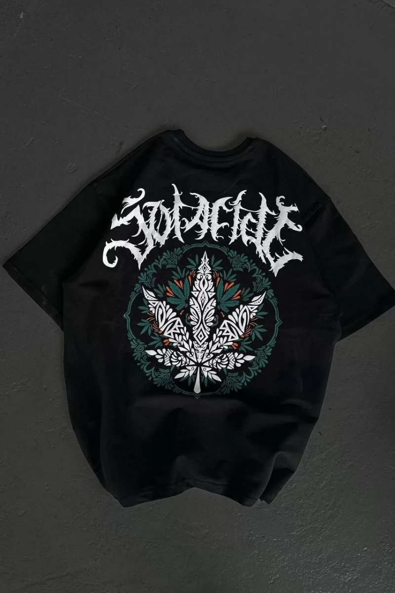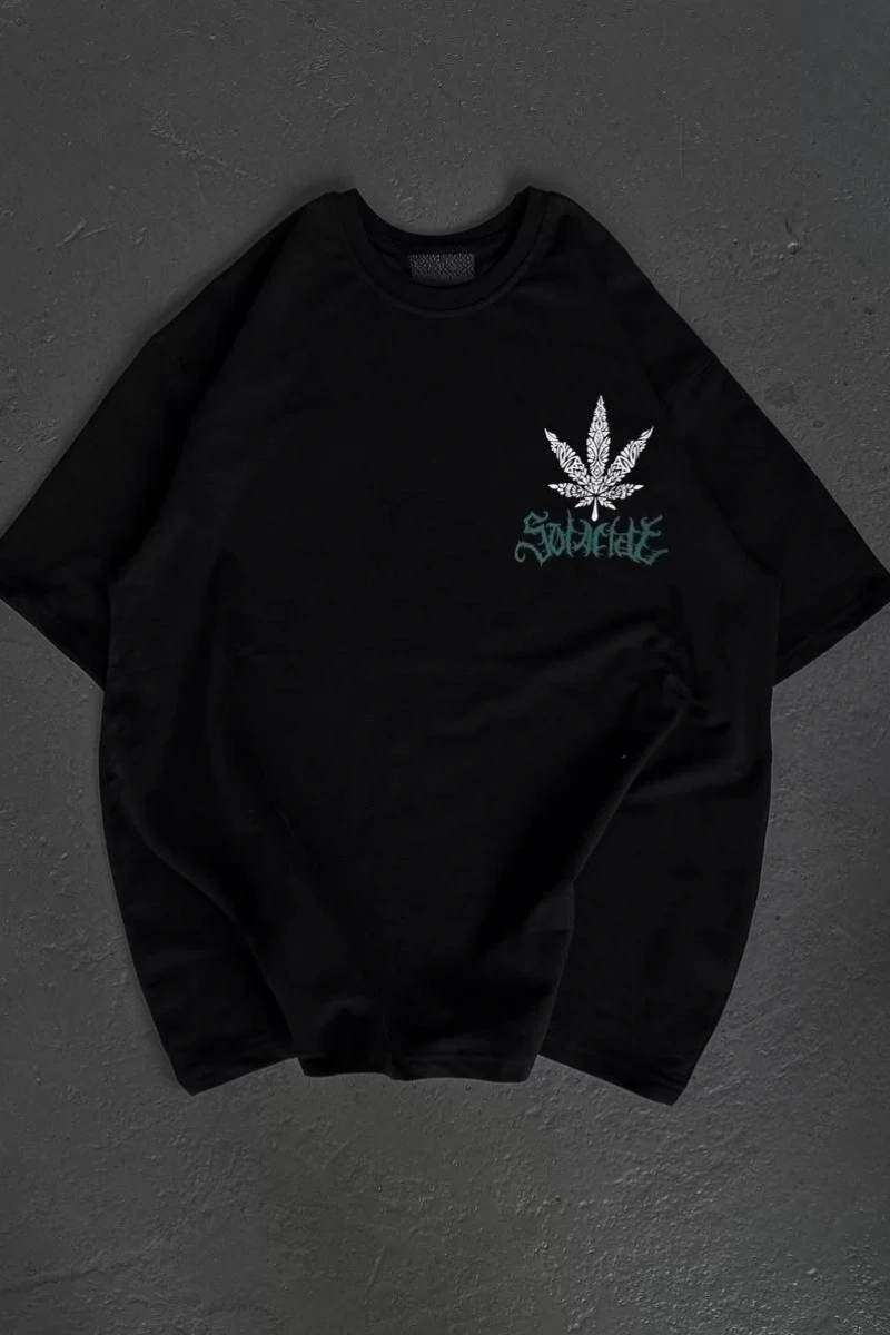 Unisex Bisiklet Yaka Baskılı Oversize T-Shirt - Siyah