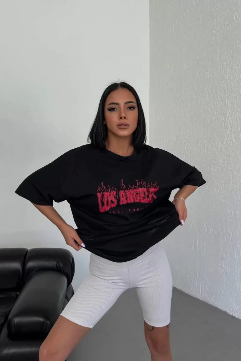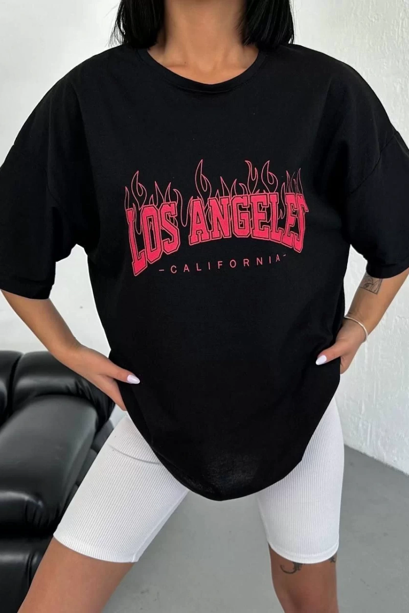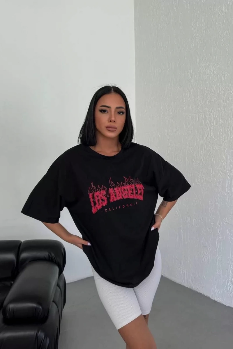 Unisex Bisiklet Yaka Baskılı Oversize T-Shirt - Siyah
