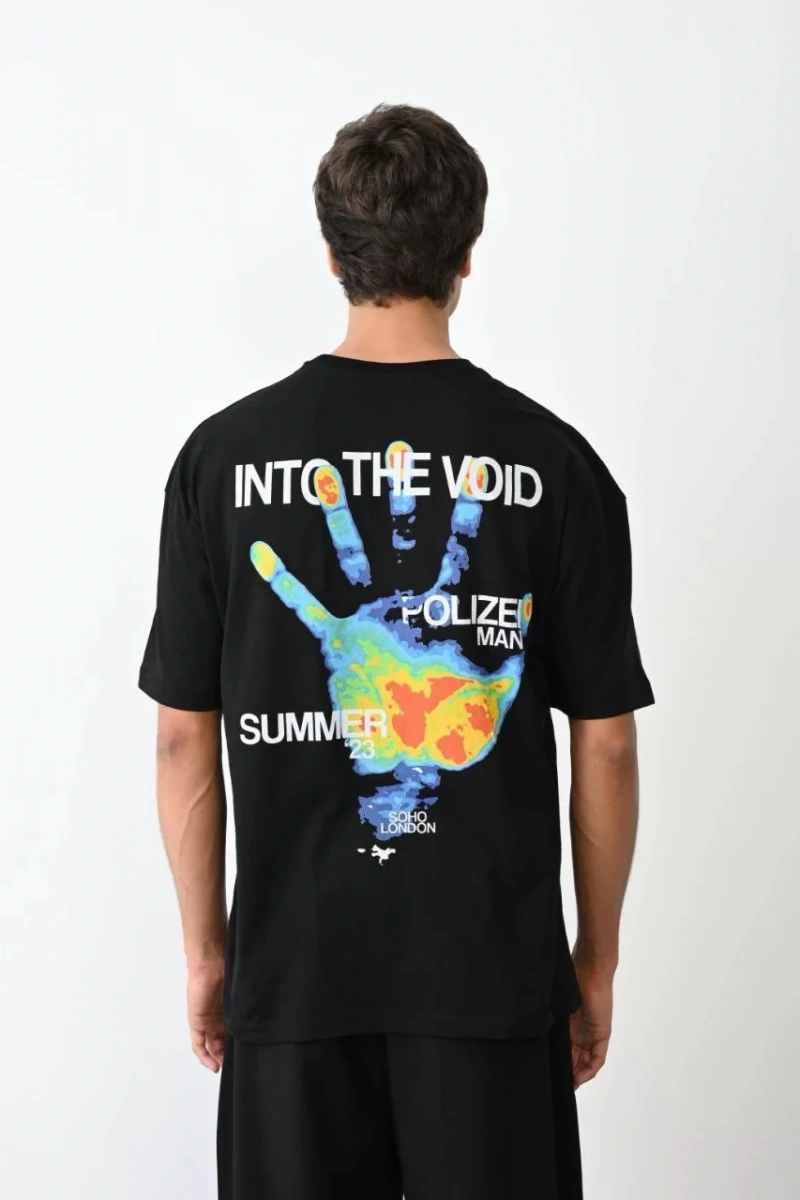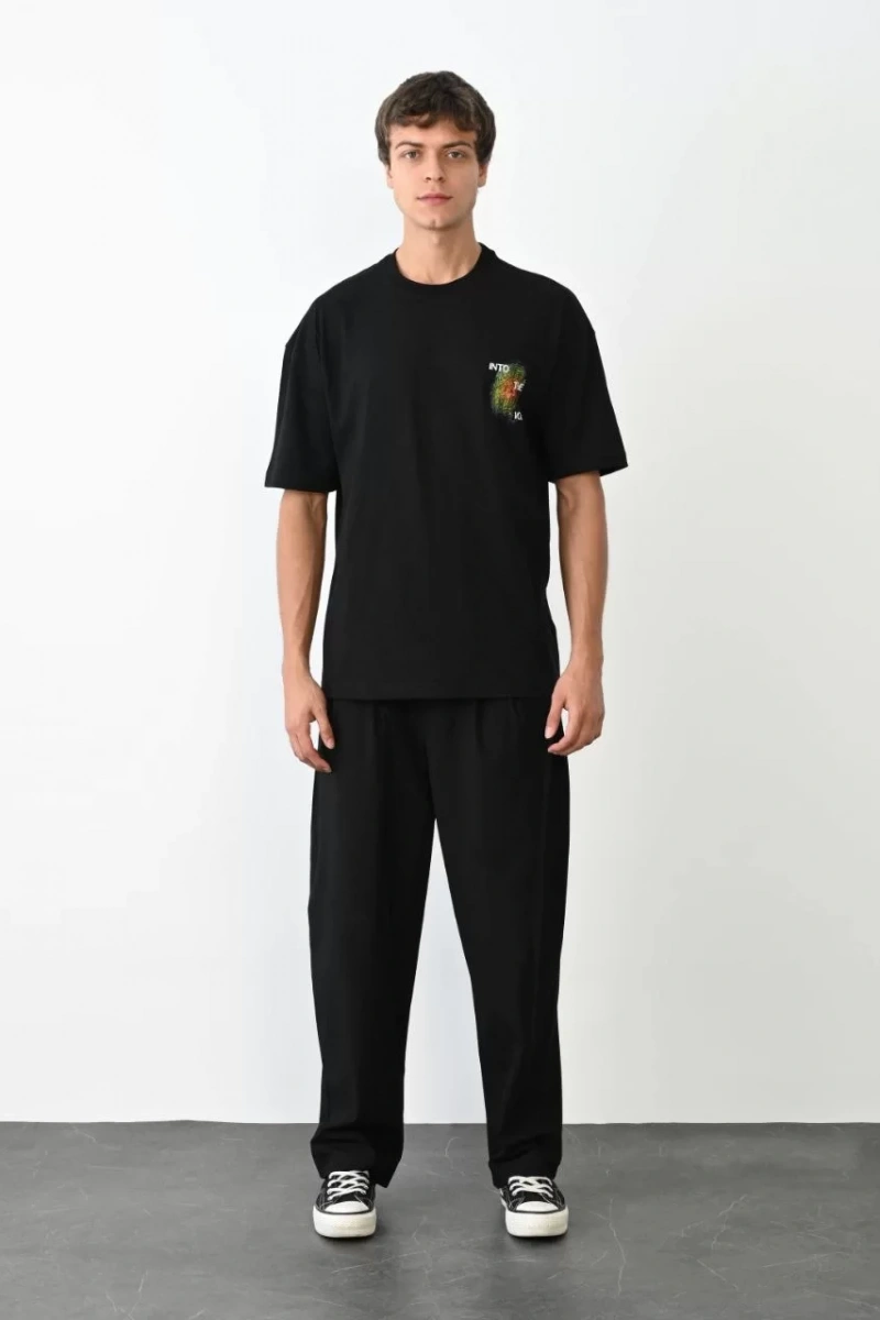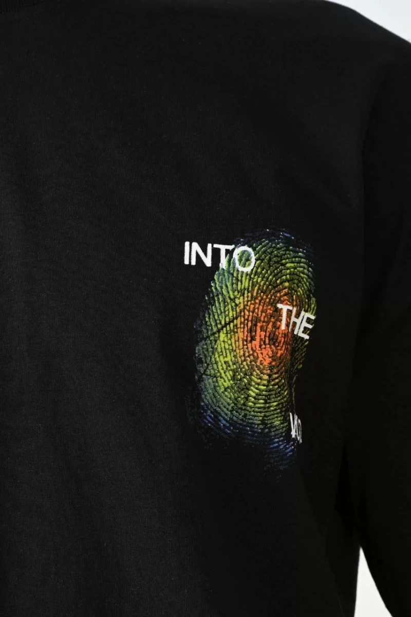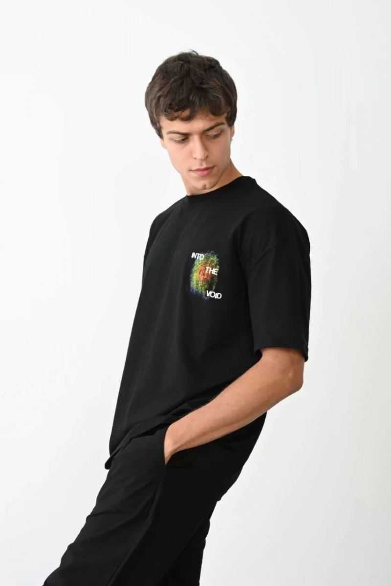 Unisex Bisiklet Yaka Baskılı Oversize T-Shirt - Siyah