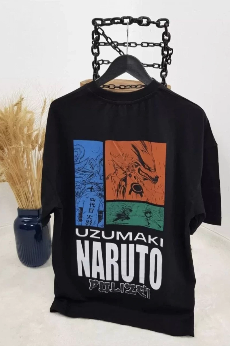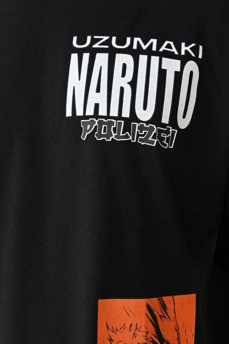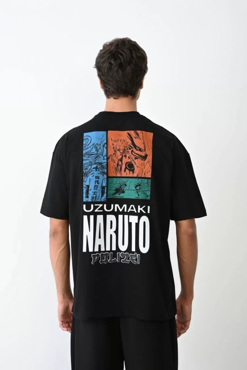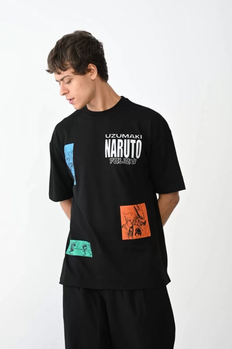 Unisex Bisiklet Yaka Baskılı Oversize T-Shirt - Siyah