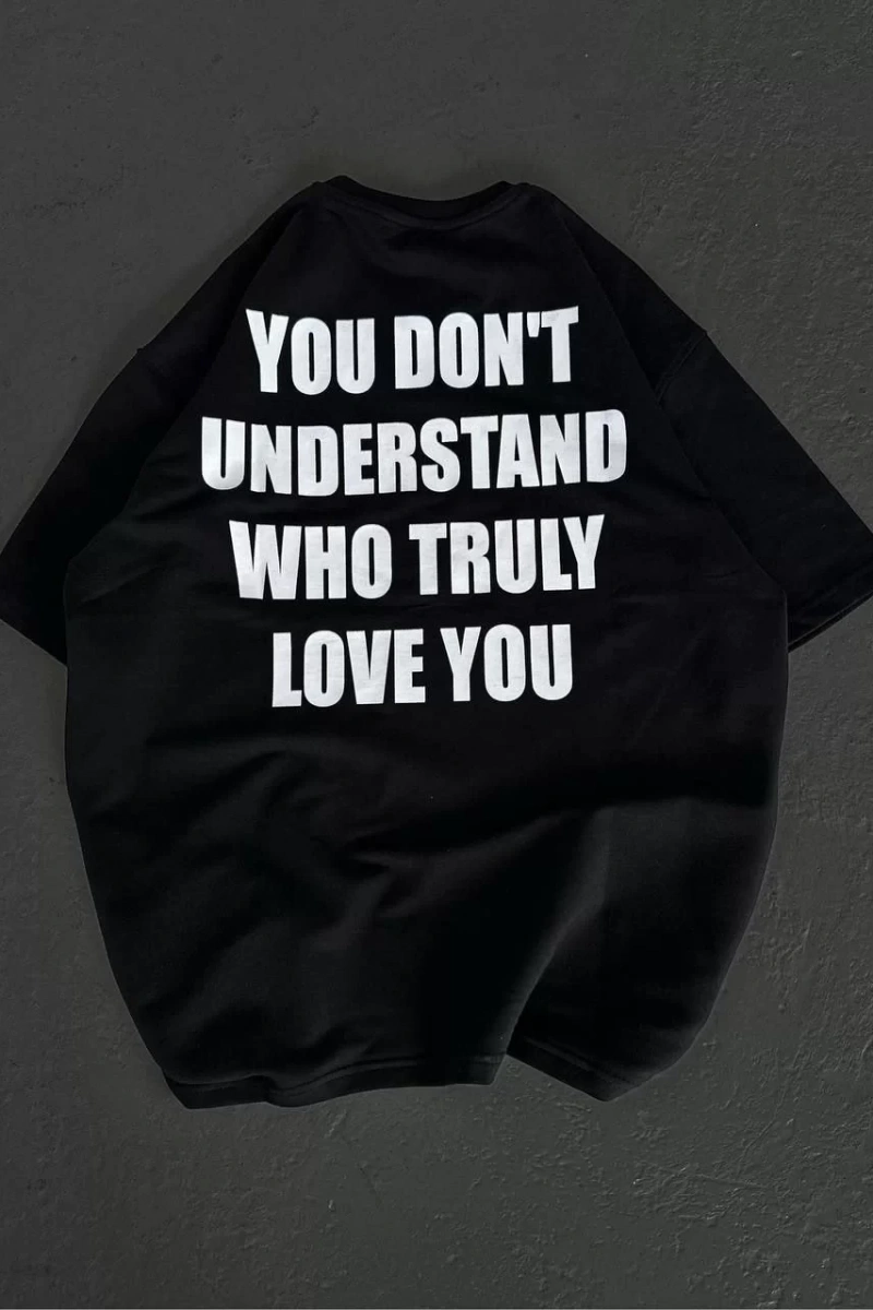 Unisex Bisiklet Yaka Baskılı Oversize T-Shirt - Siyah