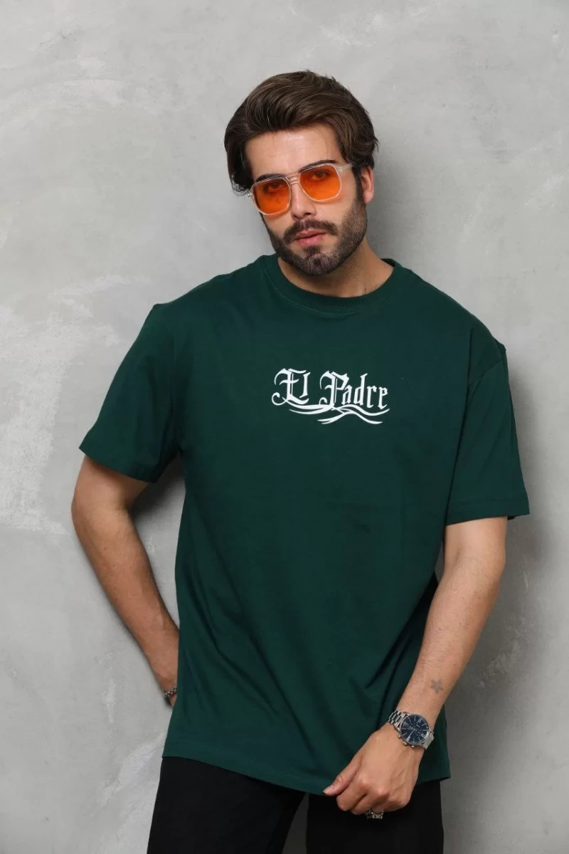 Unisex Bisiklet Yaka Baskılı Oversize T-Shirt - Yeşil