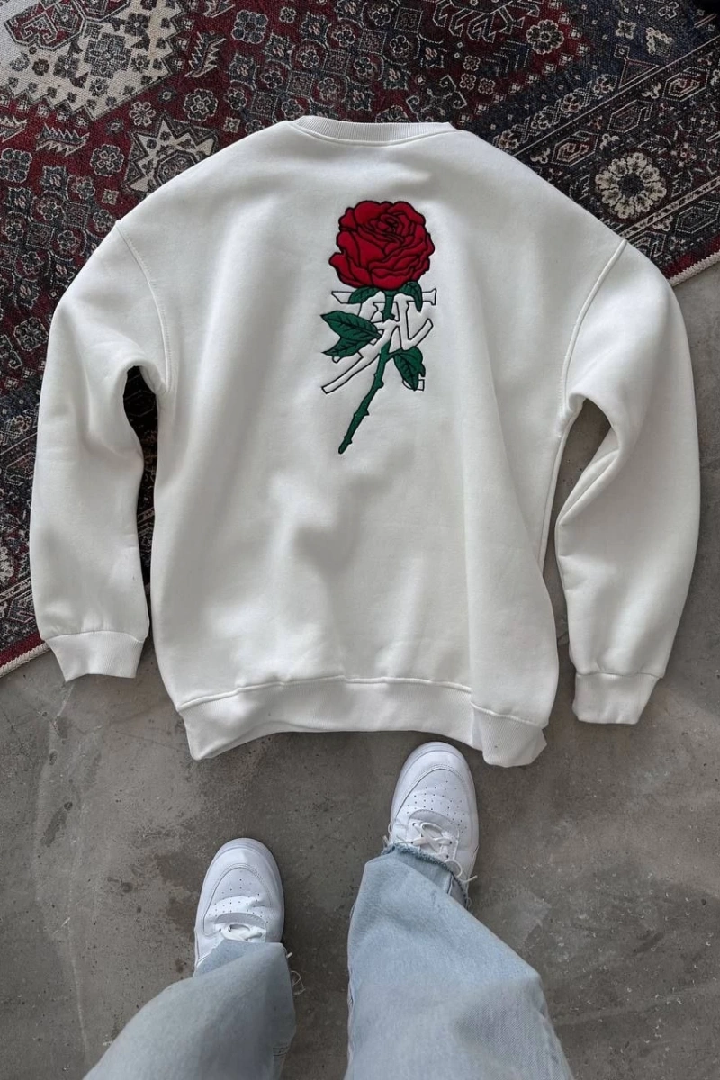 Unisex Bisiklet Yaka Ön Ve Arka Baskılı SweatShirt - Beyaz
