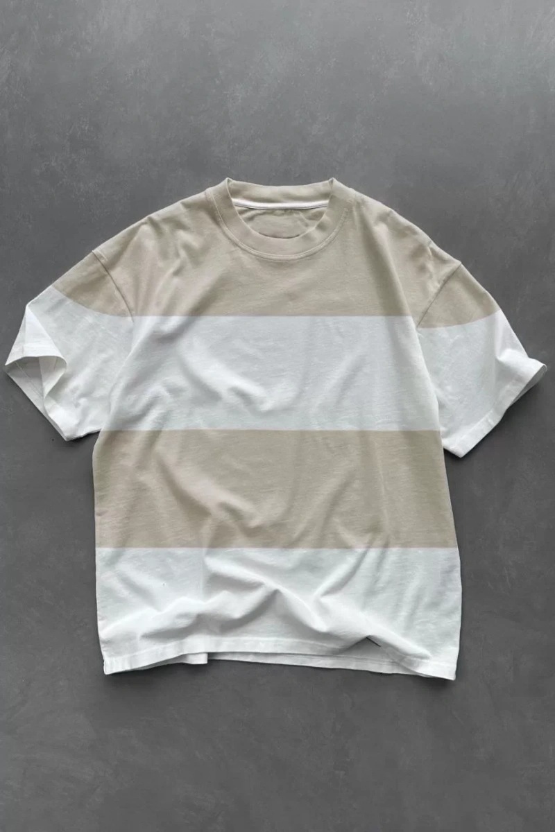Unisex Bisiklet Yaka Parçalı T-Shirt - Bej