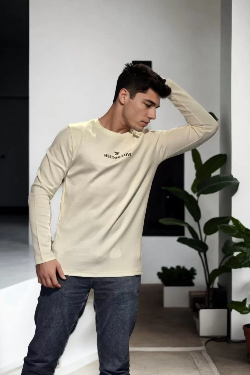 Unisex Bisiklet Yaka Uzun Kollu T-Shirt - Beyaz