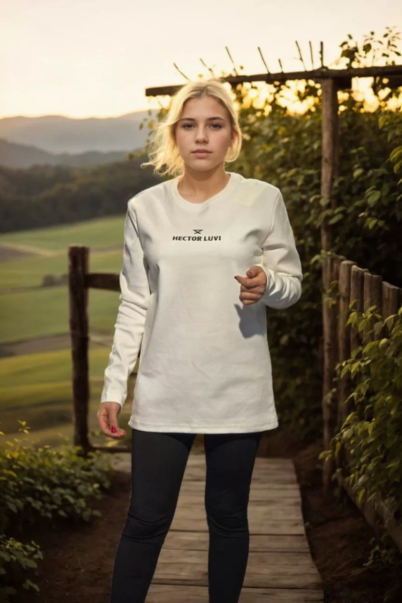 Unisex Bisiklet Yaka Uzun Kollu T-Shirt - Beyaz