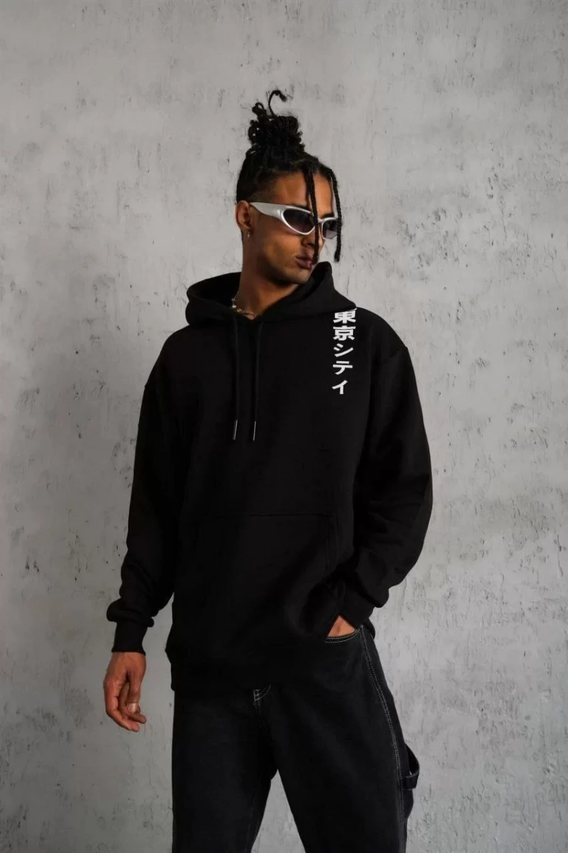 Unisex Kapşonlu Uzun Kol Baskılı Sweetshirt - Siyah