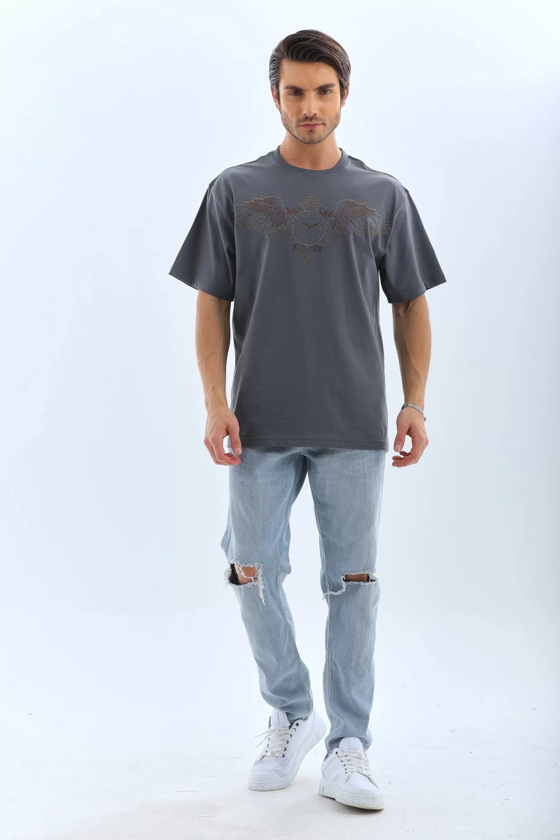 Unisex Oversize Taşlı Bisiklet Yaka T-Shirt - Füme