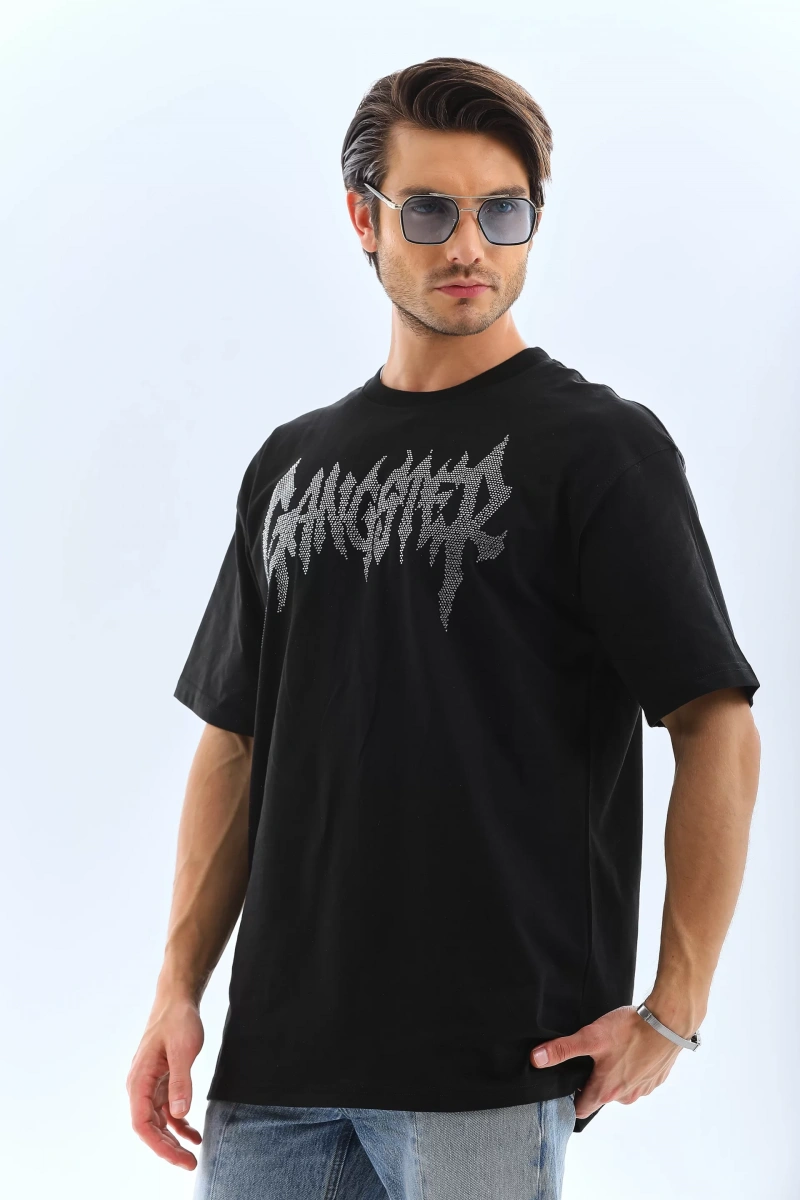 Unisex Oversize Taşlı Bisiklet Yaka T-Shirt - Siyah