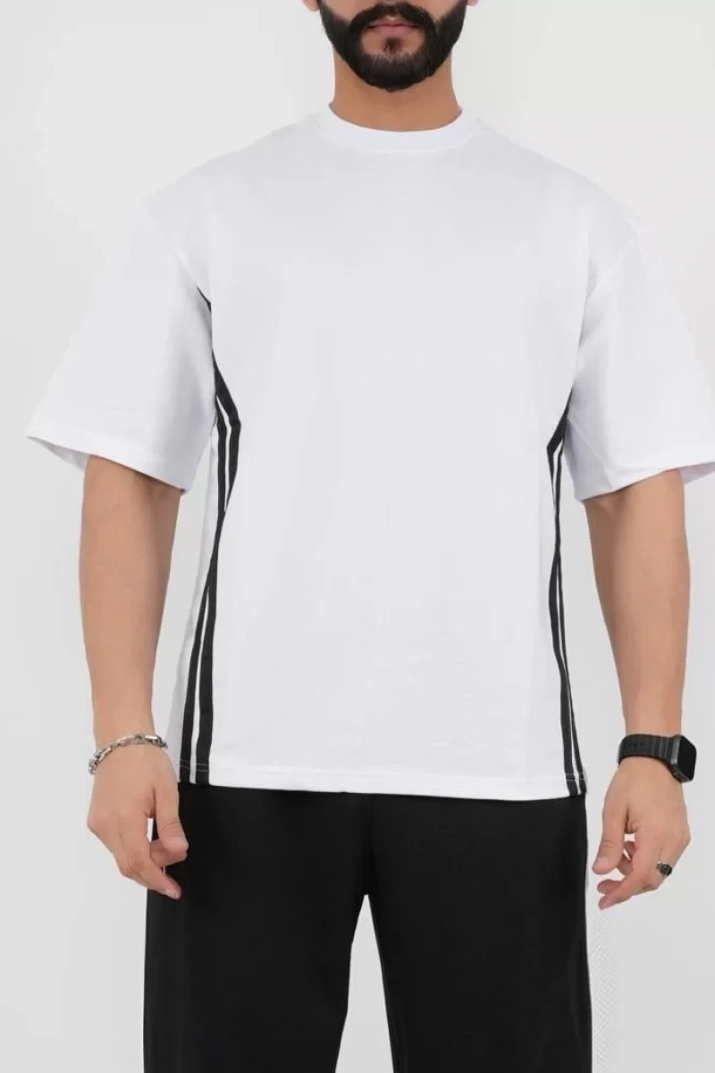 Unisex Oversize Yanları Şeritli T-Shirt - Beyaz