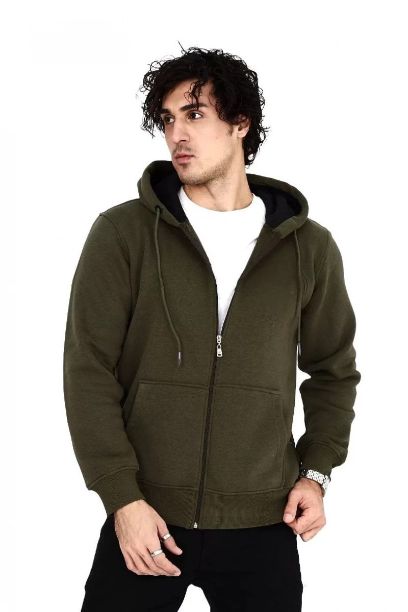 Unisex Tam Fermuarlı Kapşonlu  SweatShirt - Haki