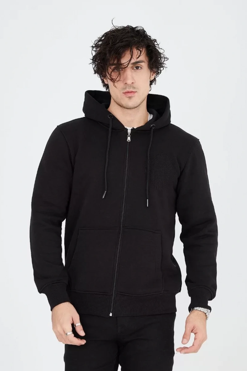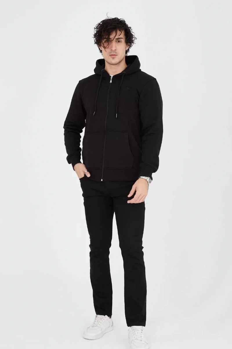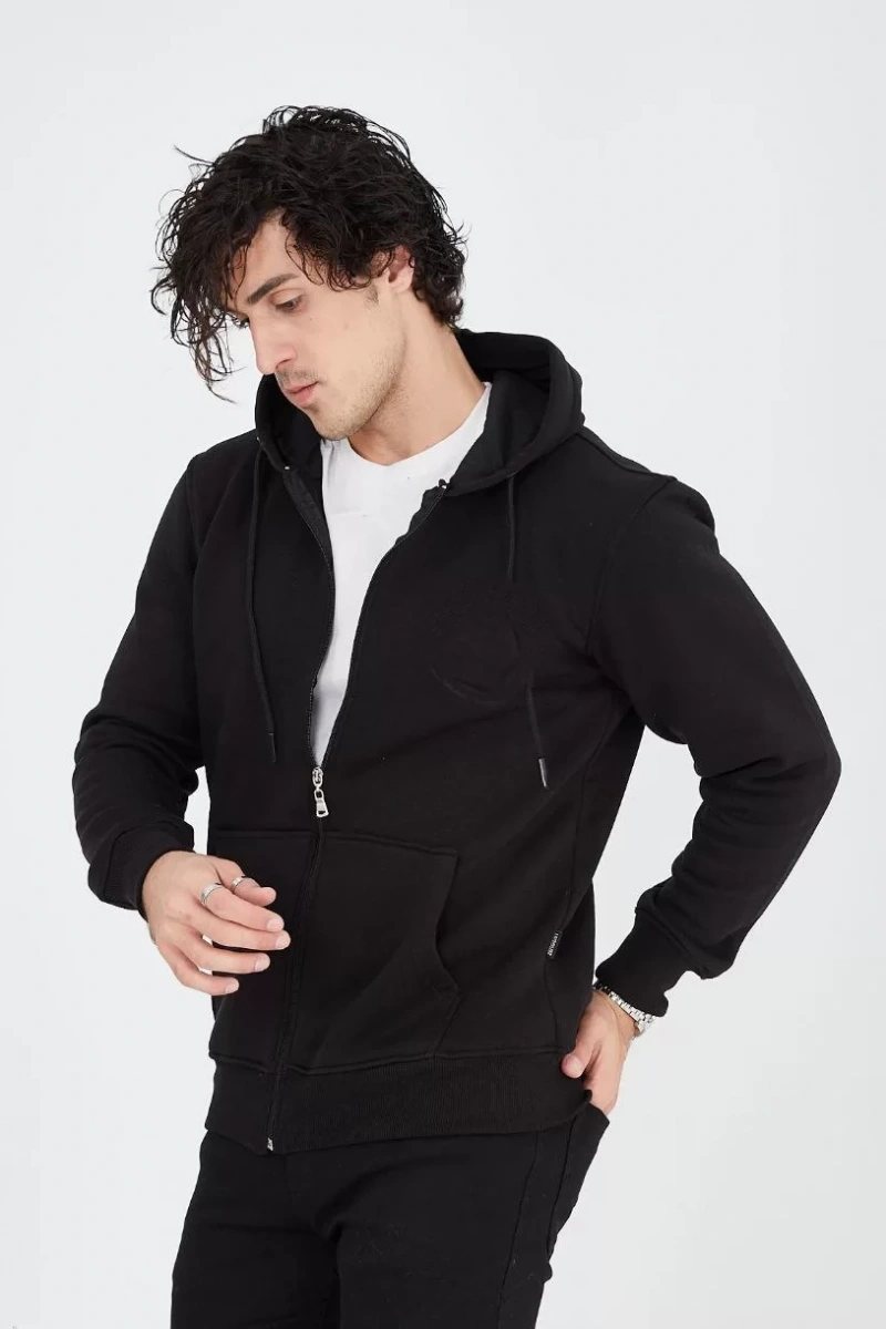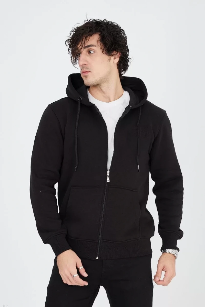Unisex Tam Fermuarlı Kapşonlu  SweatShirt - Siyah