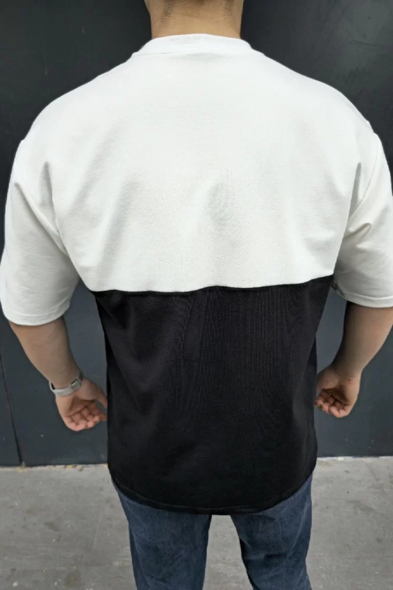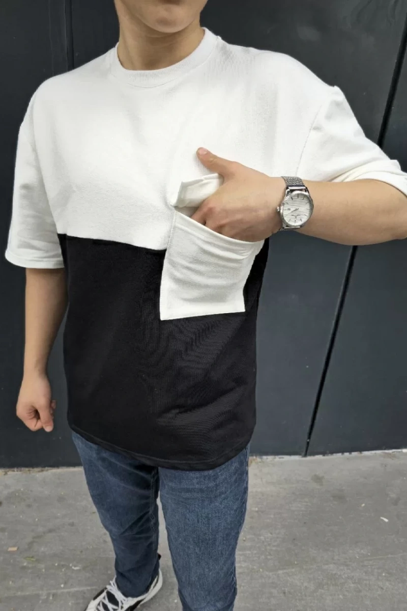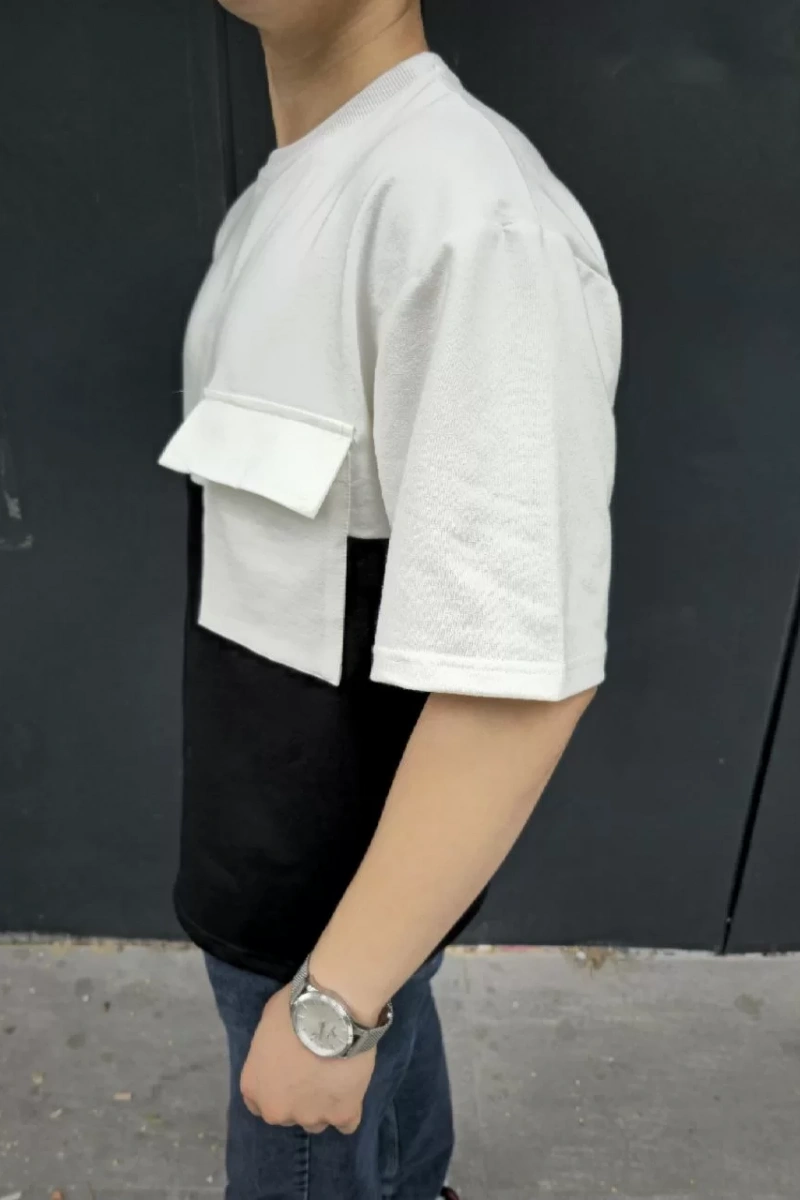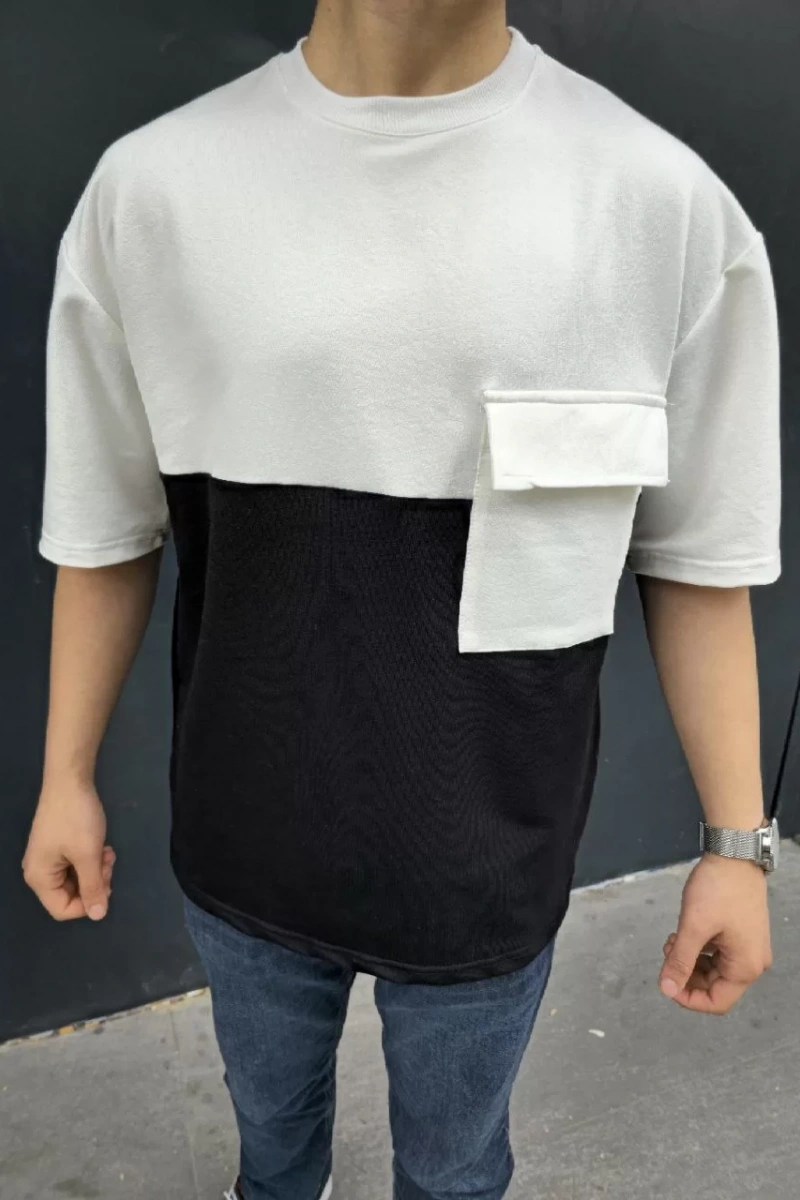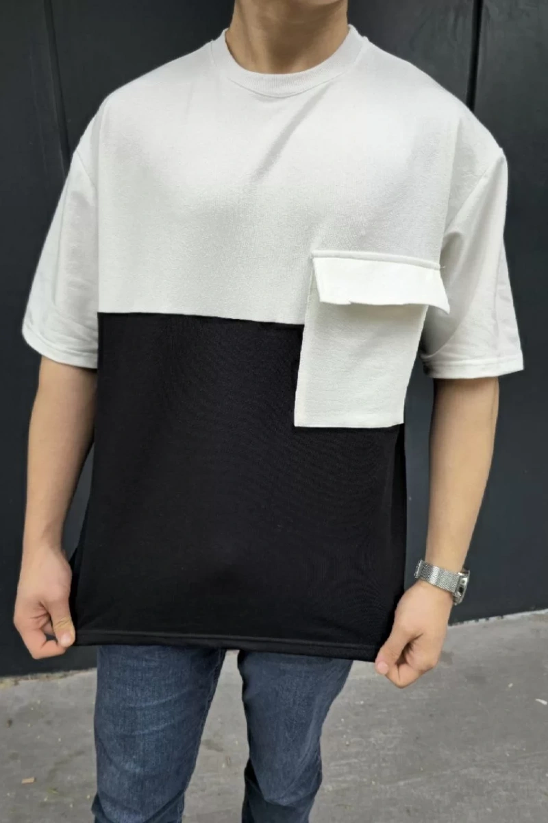 Unisex Torba Cep Detaylı Parçalı T-Shirt - Siyah