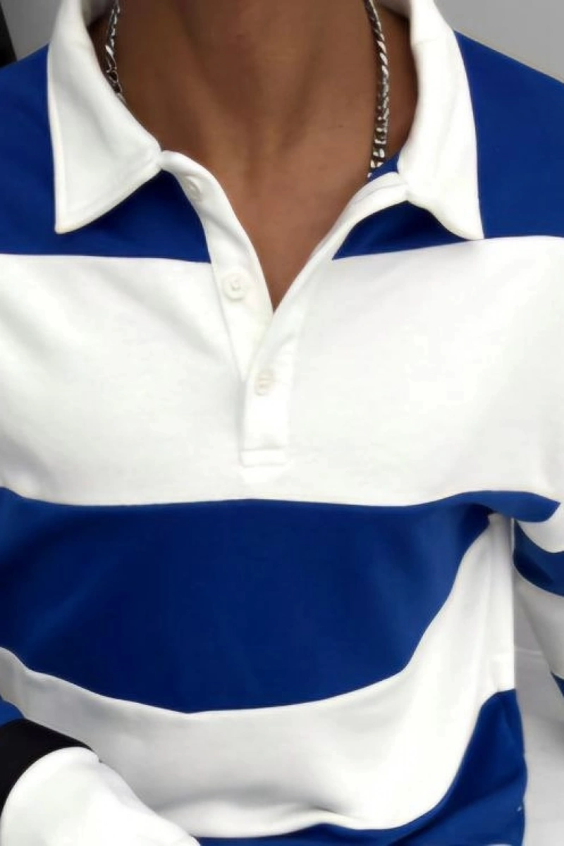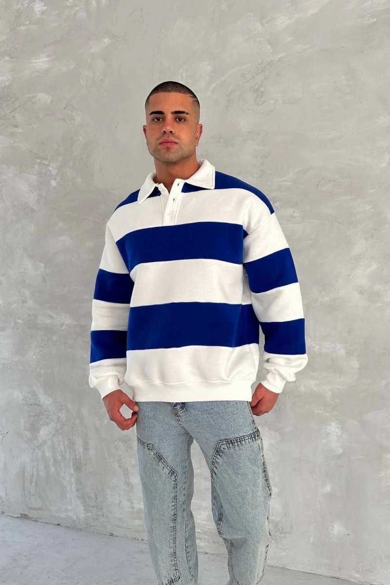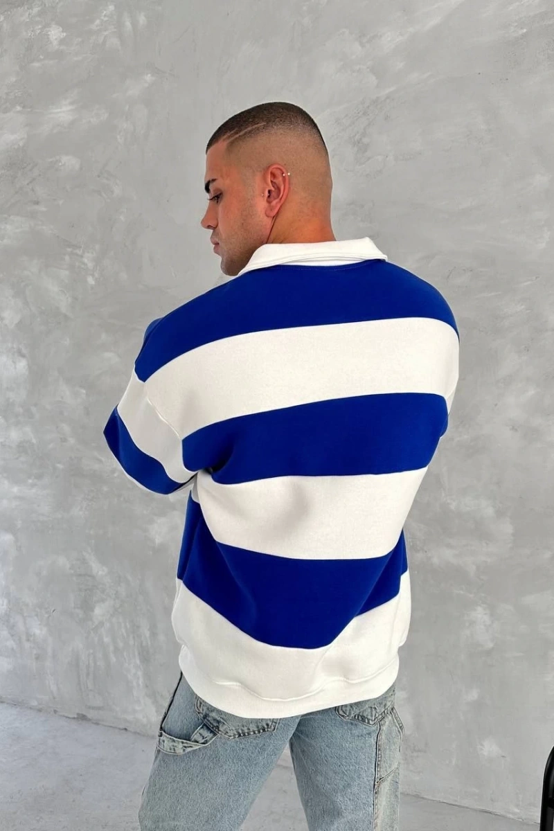 Unisex Üç İplik Parçalı Yakalı SweatShirt - Mavi