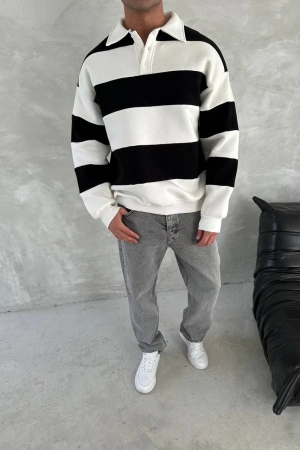Unisex Üç İplik Parçalı Yakalı SweatShirt - Siyah