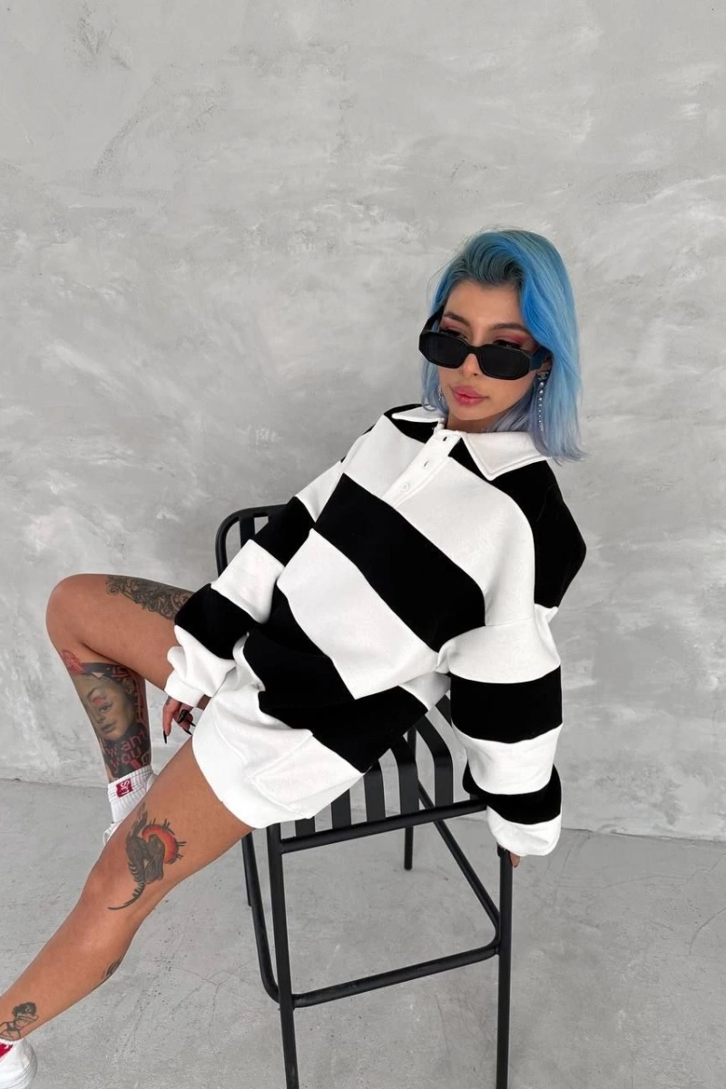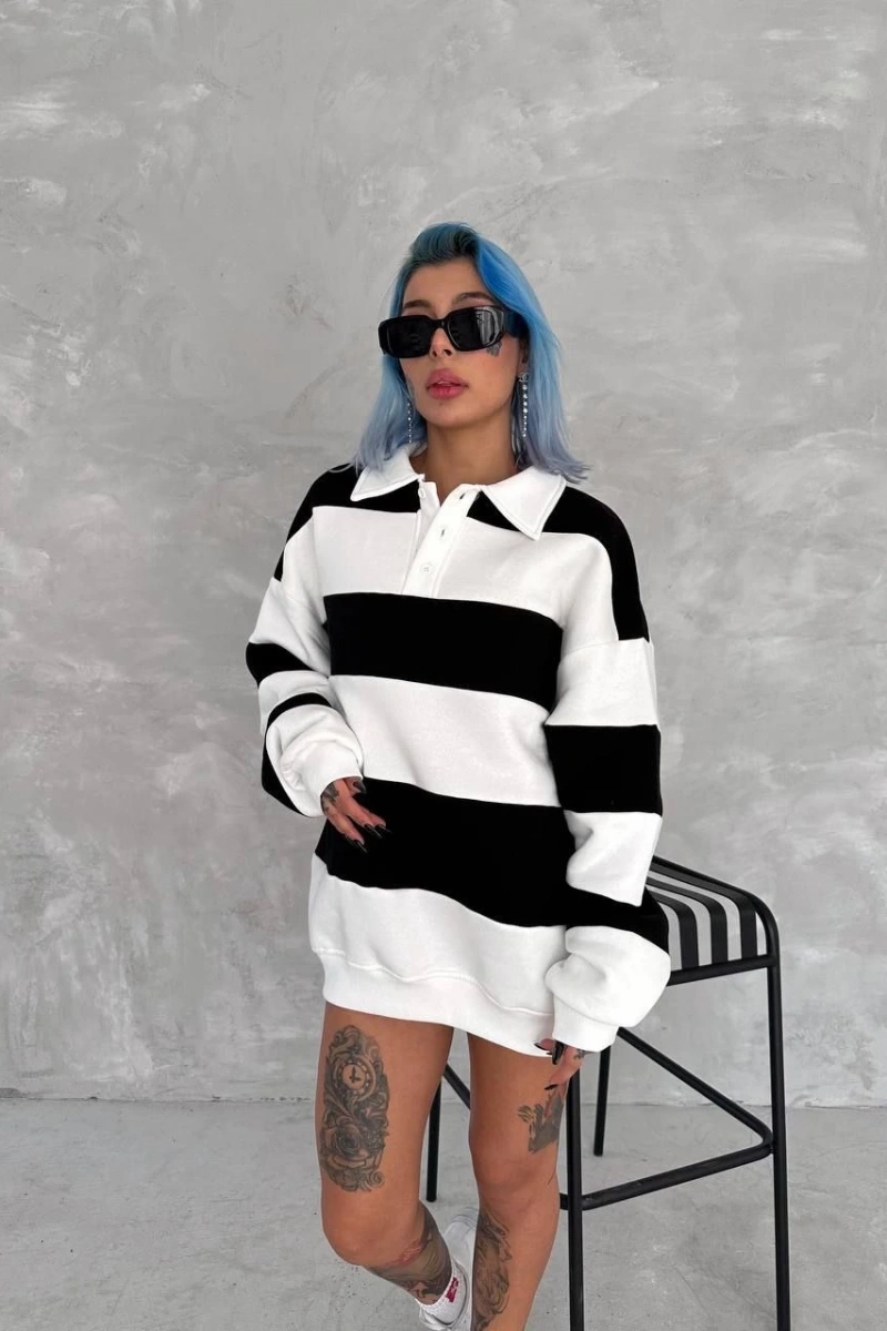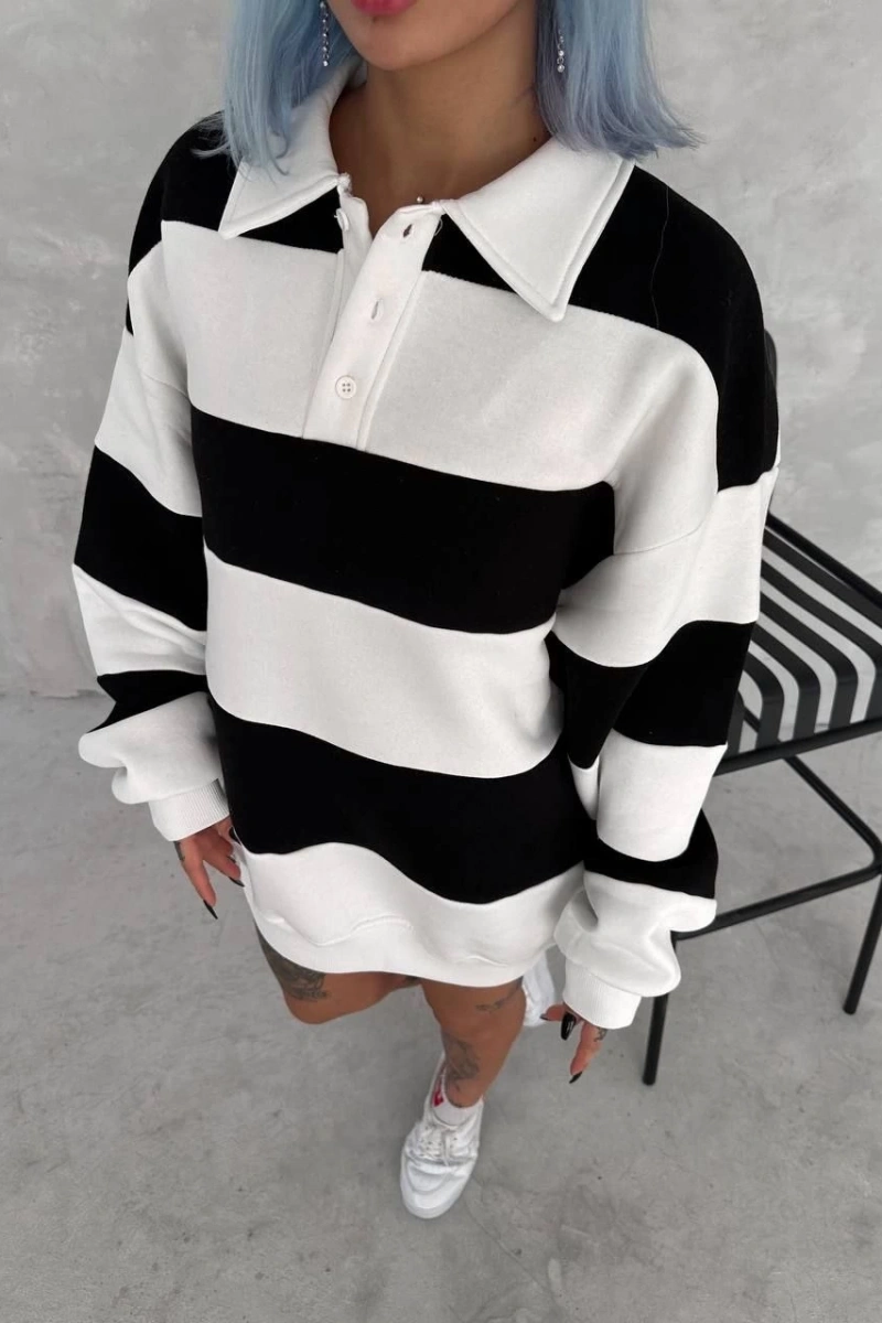 Unisex Üç İplik Parçalı Yakalı SweatShirt - Siyah