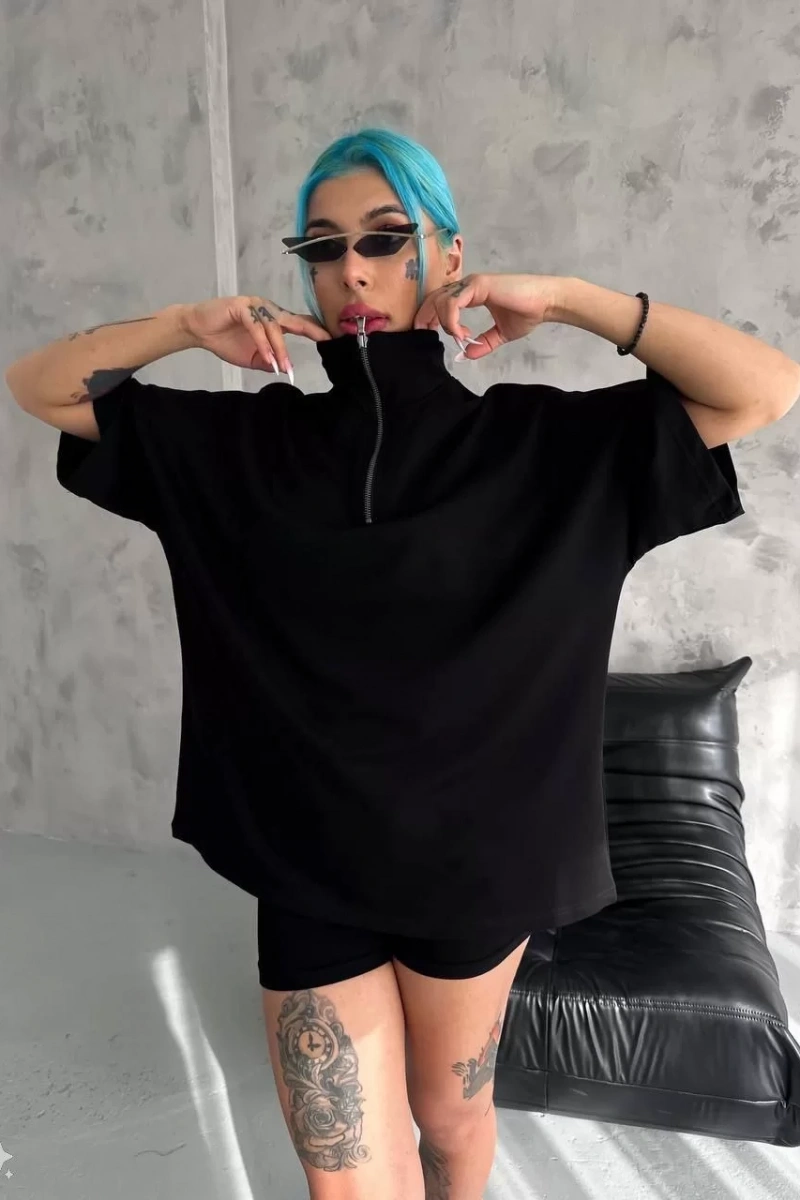 Unisex Yarım Fermuarlı Basic T-Shirt - Siyah