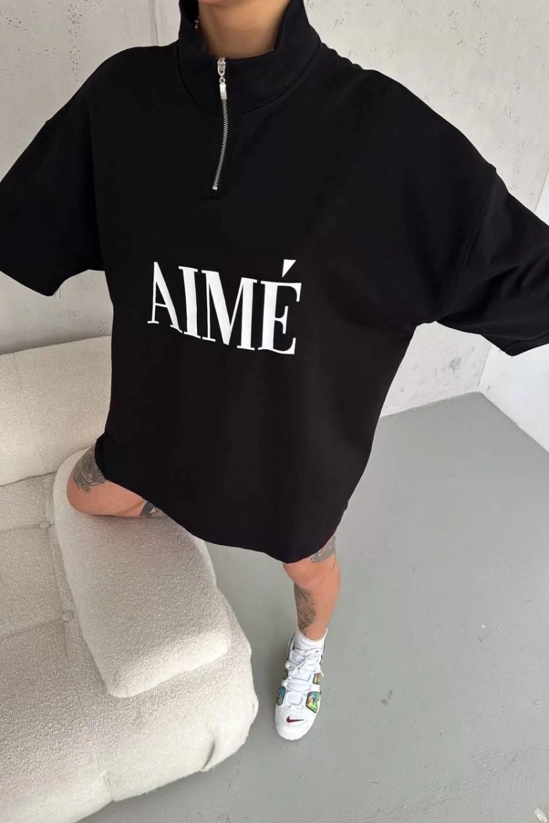 Unisex Yarım Fermuarlı Baskılı T-Shirt - Siyah