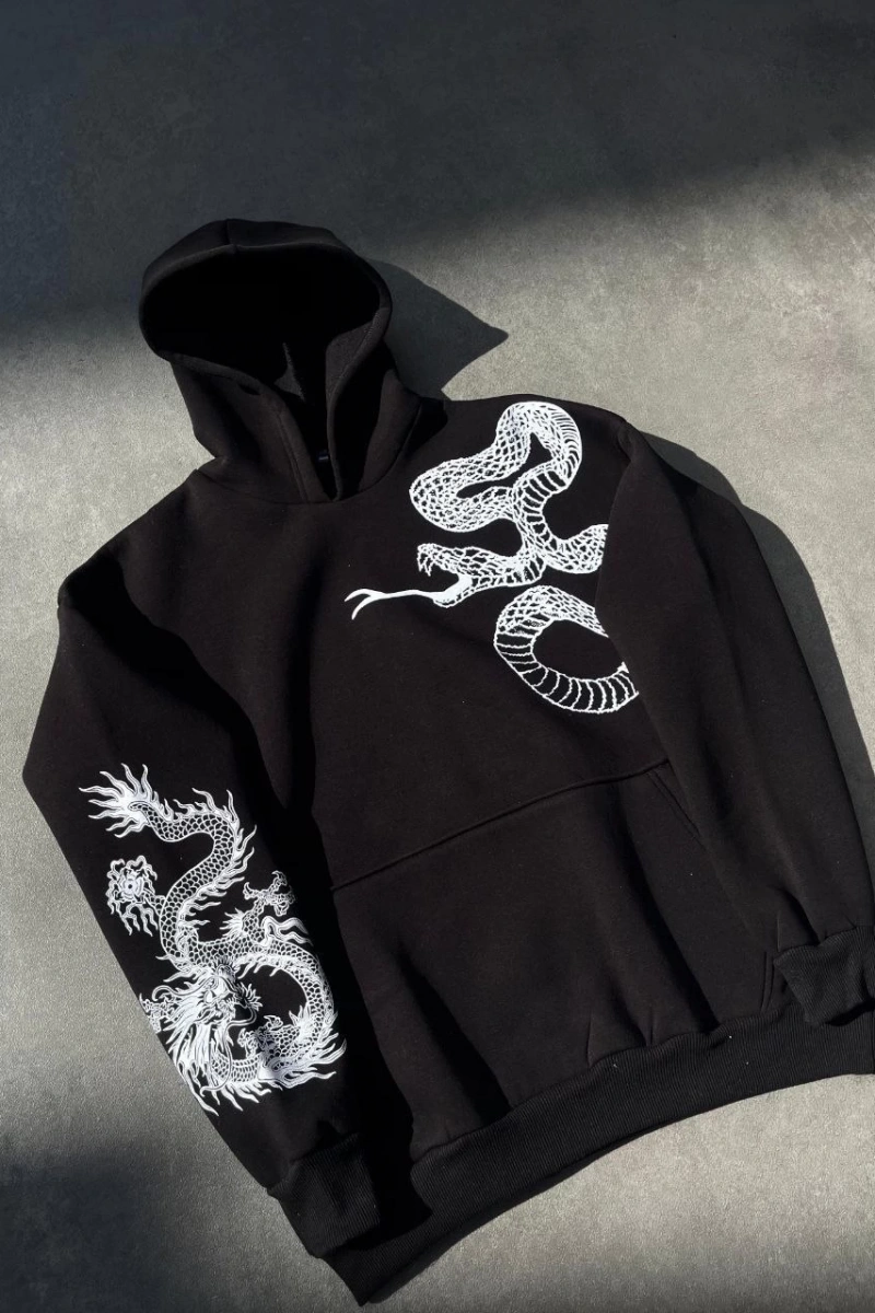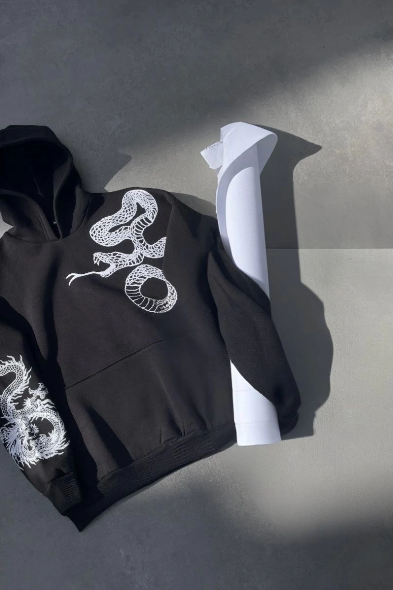 Uzun Kol Kapüşonlu Baskılı SweatShirt - Siyah