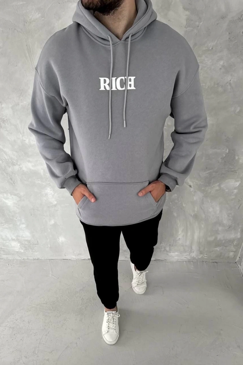 Uzun Kol Kapüşonlu Göğüs Baskılı SweatShirt - Gri