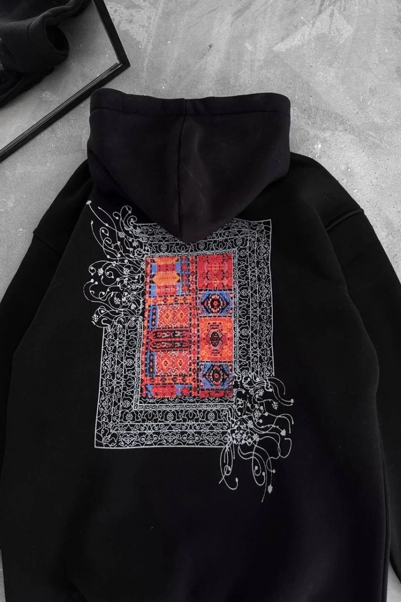 Uzun Kol Kapüşonlu Ön Ve Arka Baskılı SweatShirt - Siyah