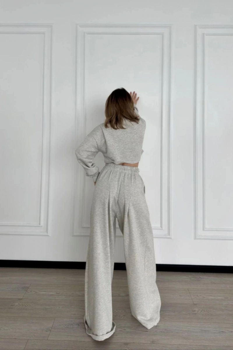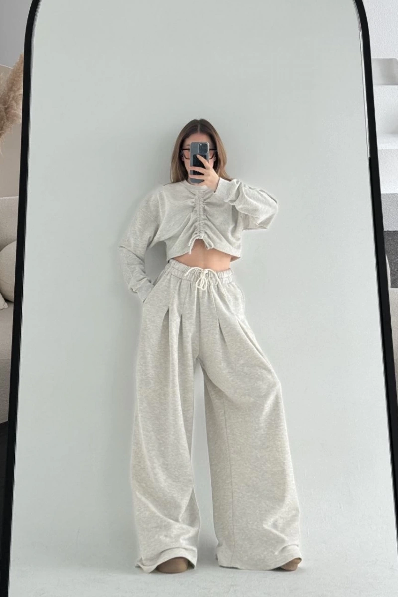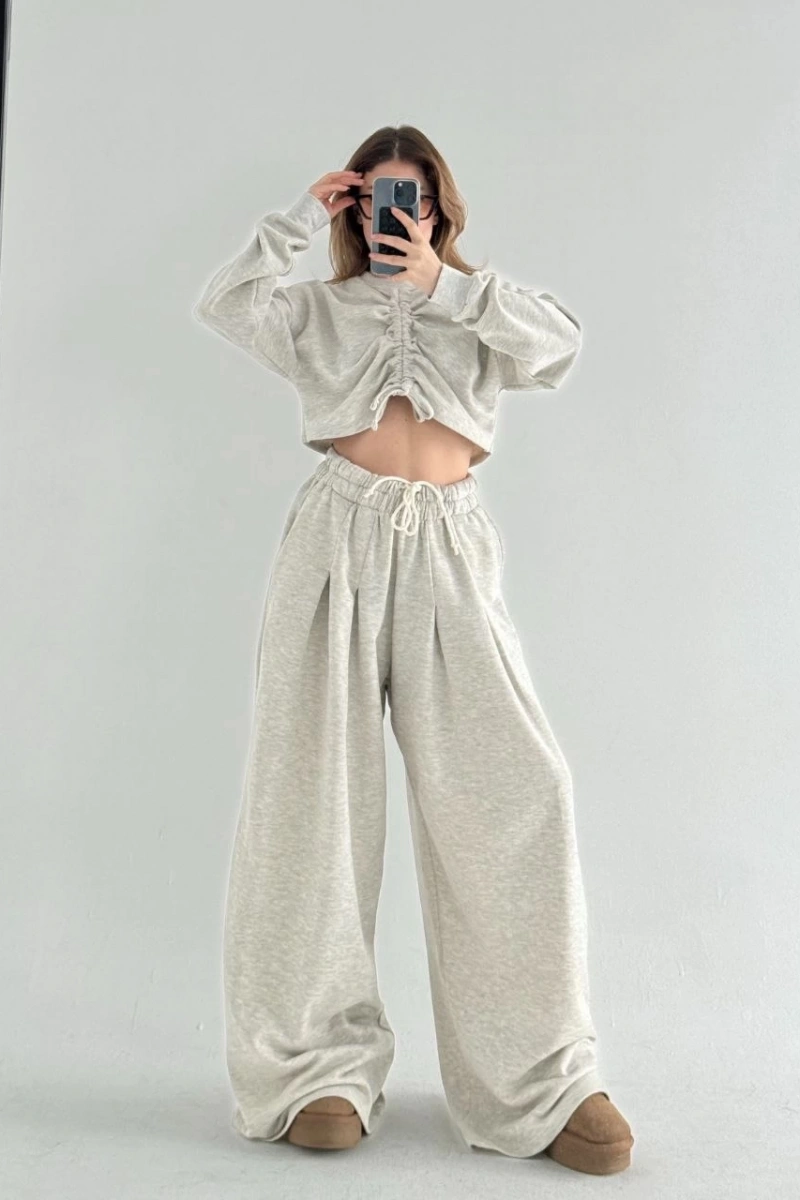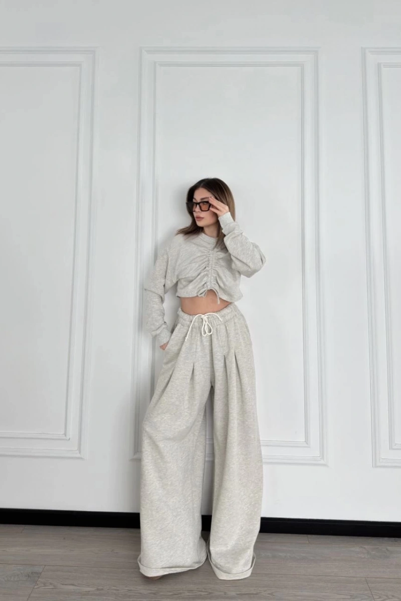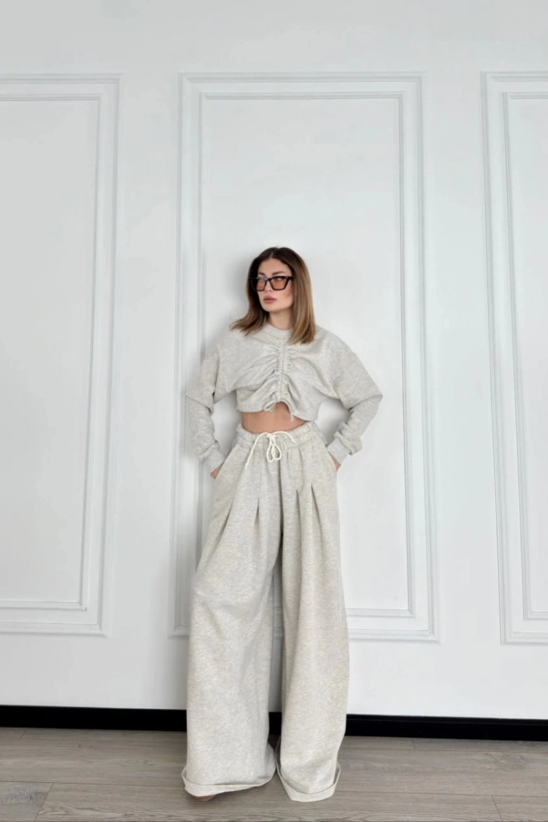 Uzun Kollu Önü İp Büzgülü Crop ve Pantolon İkili Takım - Gri